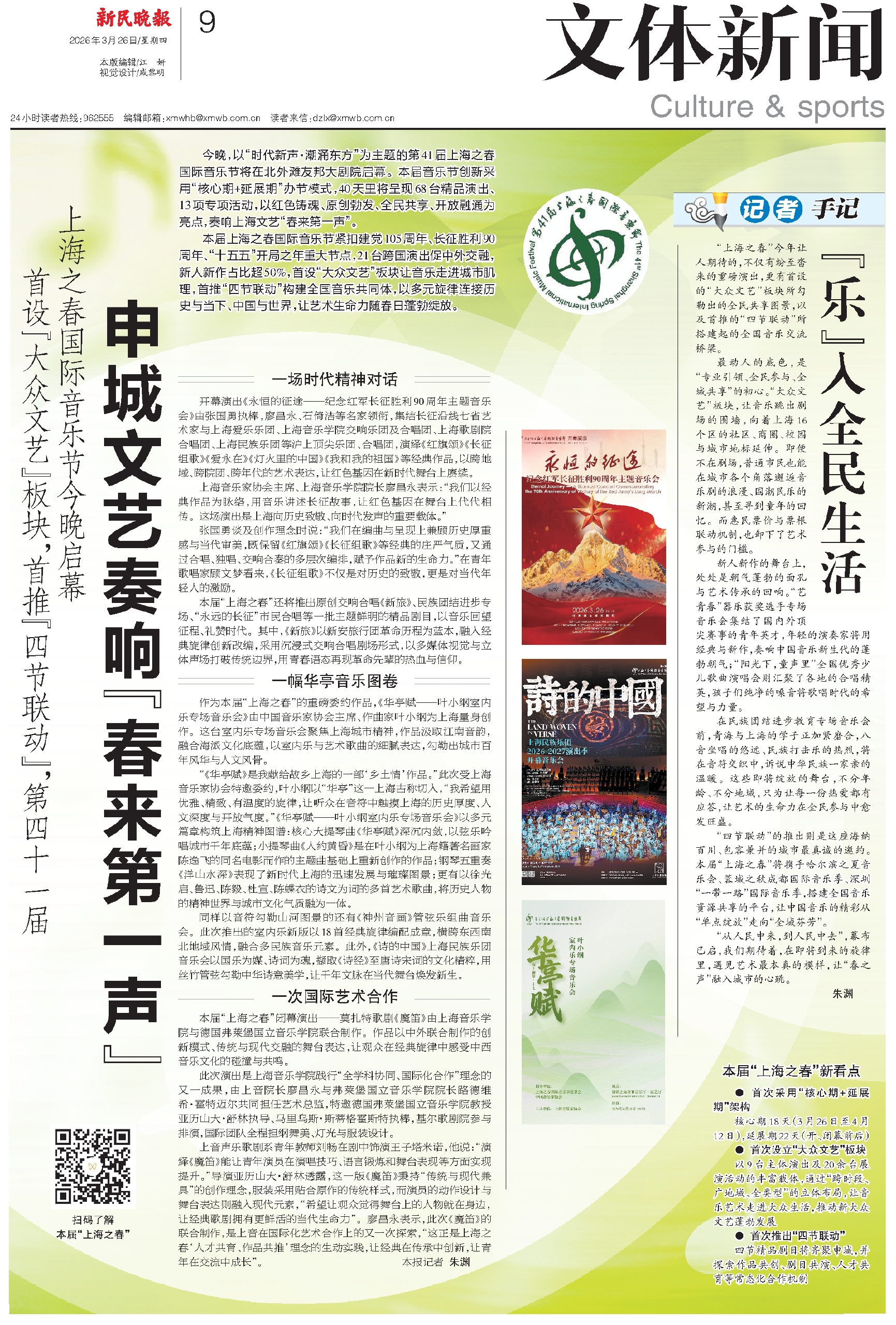 本届上海之春国际音乐节紧扣建党105周年、长征胜利90周年、“十五五”开局之年重大节点,21台跨国演出促中外交融,新人新作占比超50%,首设“大众文艺”板块让音乐走进城市肌理,首推“四节联动”构建全国音乐共同体,以多元旋律连接历史与当下、中国与世界,让艺术生命力随春日蓬勃绽放。