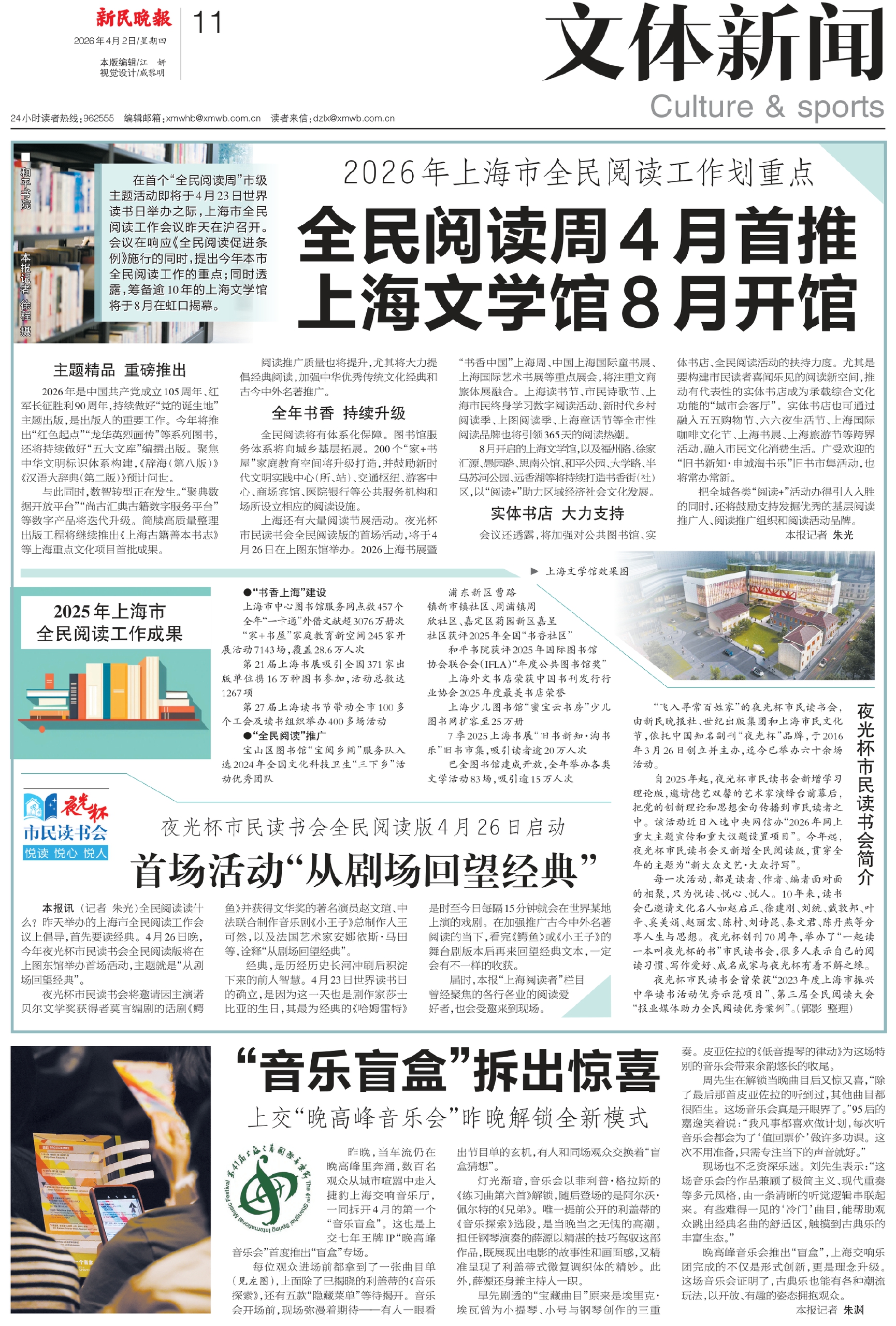 上海还有大量阅读节展活动。夜光杯市民读书会全民阅读版的首场活动,将于4月26日在上图东馆举办。2026上海书展暨“书香中国”上海周、中国上海国际童书展、上海国际艺术书展等重点展会,将注重文商旅体展融合。上海读书节、市民诗歌节、上海市民终身学习数字阅读活动、新时代乡村阅读季、上图阅读季、上海童话节等全市性阅读品牌也将引领365天的阅读热潮。
