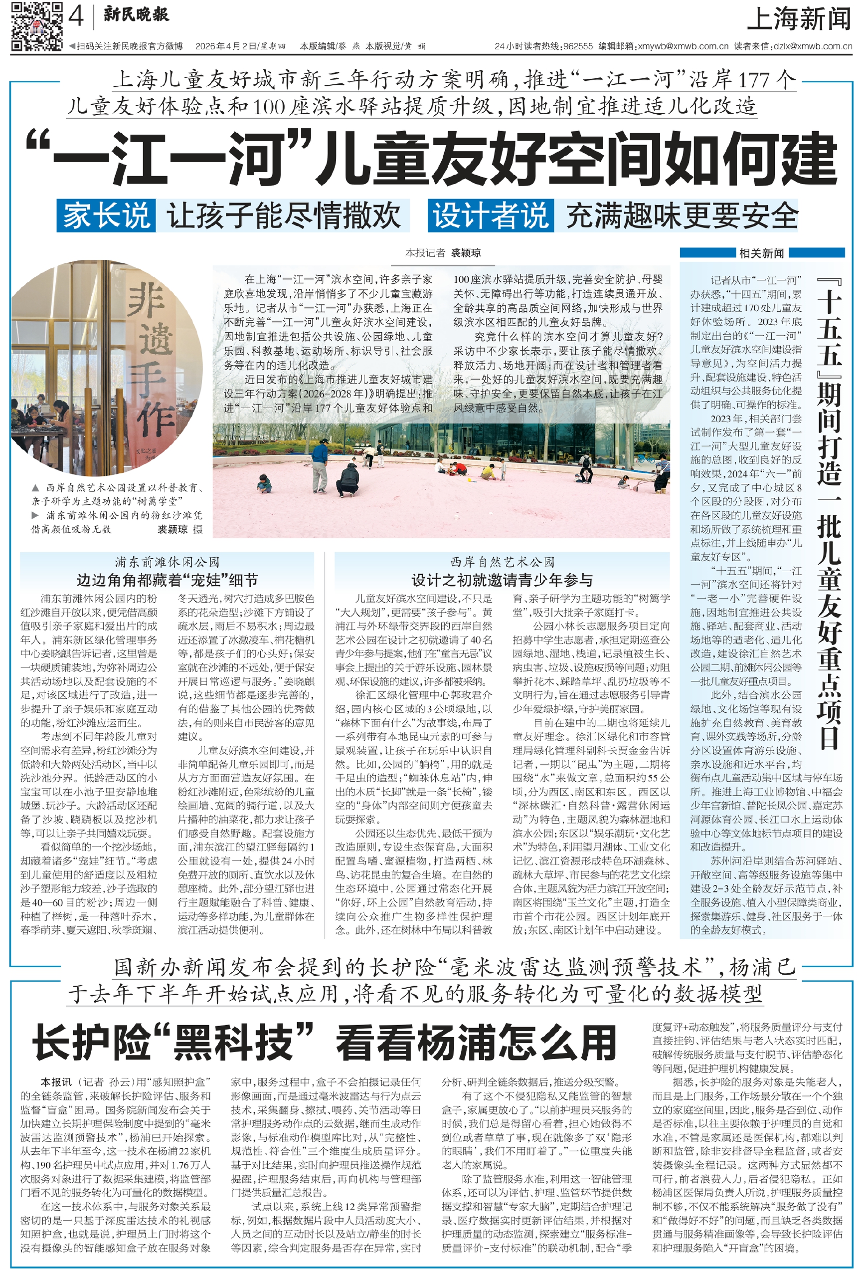 “十五五”期间,“一江一河”滨水空间还将针对“一老一小”完善硬件设施,因地制宜推进公共设施、驿站、配套商业、活动场地等的适老化、适儿化改造,建设徐汇自然艺术公园二期、前滩休闲公园等一批儿童友好重点项目。