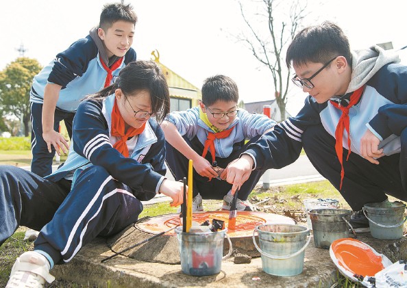 昨天上午,在金山区漕泾镇水库村,50名来自上海市西林中学七年级的学子,用青春画笔为美丽乡村“添彩”。 本报记者 陶磊 摄影报道