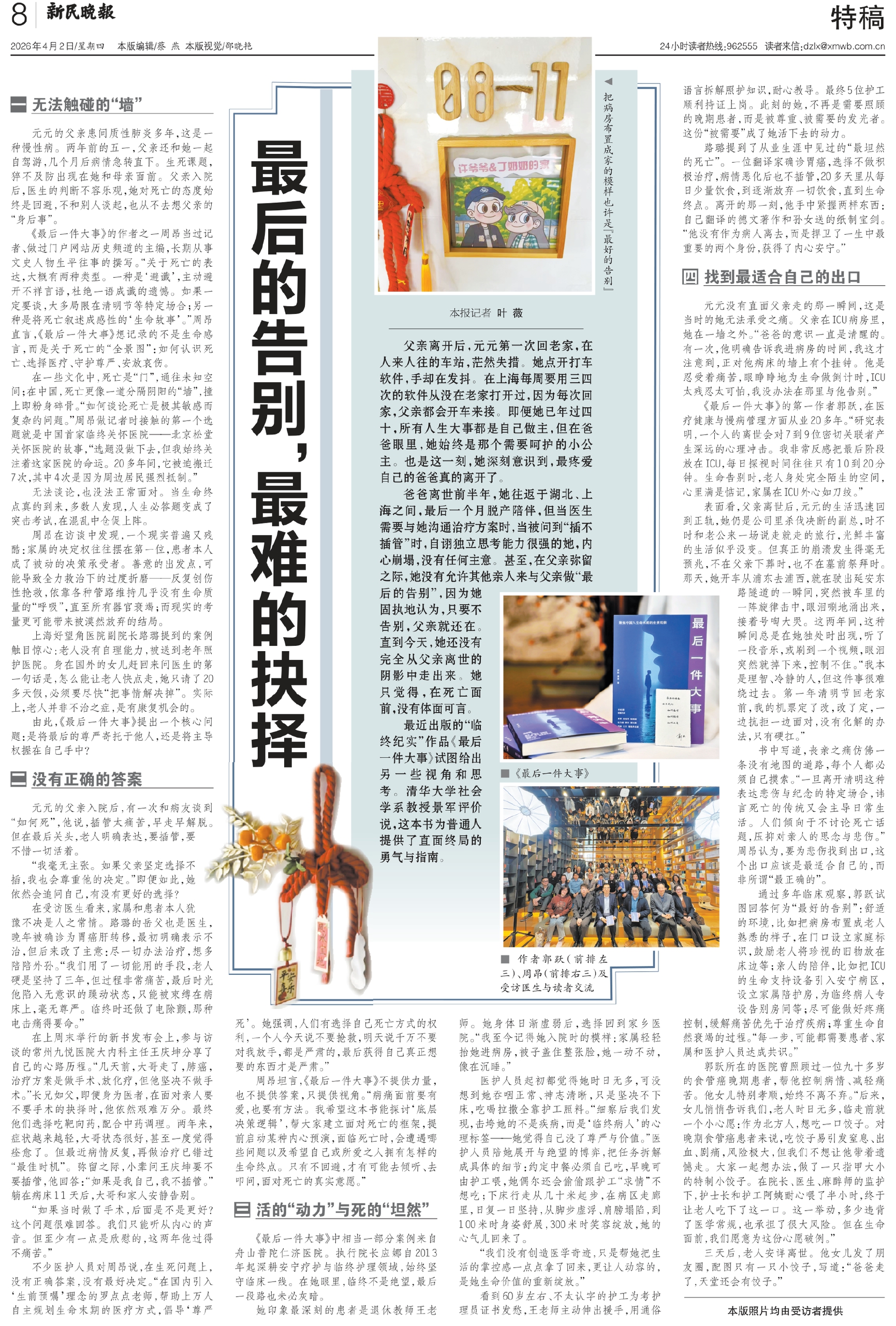 《最后一件大事》的作者之一周昂当过记者、做过门户网站历史频道的主编,长期从事文史人物生平往事的撰写。“关于死亡的表达,大概有两种类型。一种是‘避谶’,主动避开不祥言语,杜绝一语成谶的遗憾。如果一定要谈,大多局限在清明节等特定场合;另一种是将死亡叙述成感性的‘生命故事’。”周昂直言,《最后一件大事》想记录的不是生命感言,而是关于死亡的“全景图”:如何认识死亡、选择医疗、守护尊严、安放哀伤。
