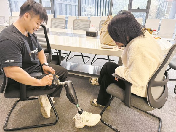 林韵(左)向记者展示仿生腿