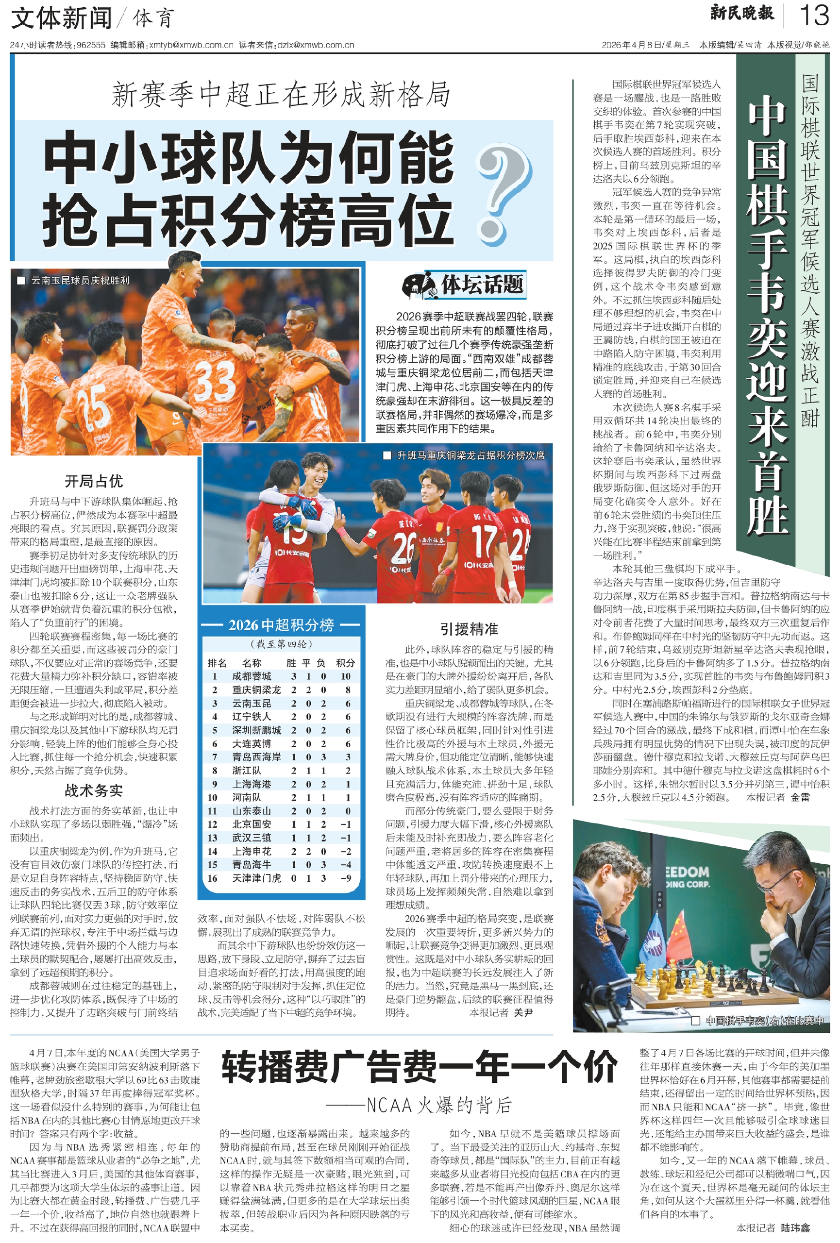 2026赛季中超的格局突变,是联赛发展的一次重要转折,更多新兴势力的崛起,让联赛竞争变得更加激烈、更具观赏性。这既是对中小球队务实耕耘的回报,也为中超联赛的长远发展注入了新的活力。当然,究竟是黑马一黑到底,还是豪门逆势翻盘,后续的联赛征程值得期待。 本报记者 关尹