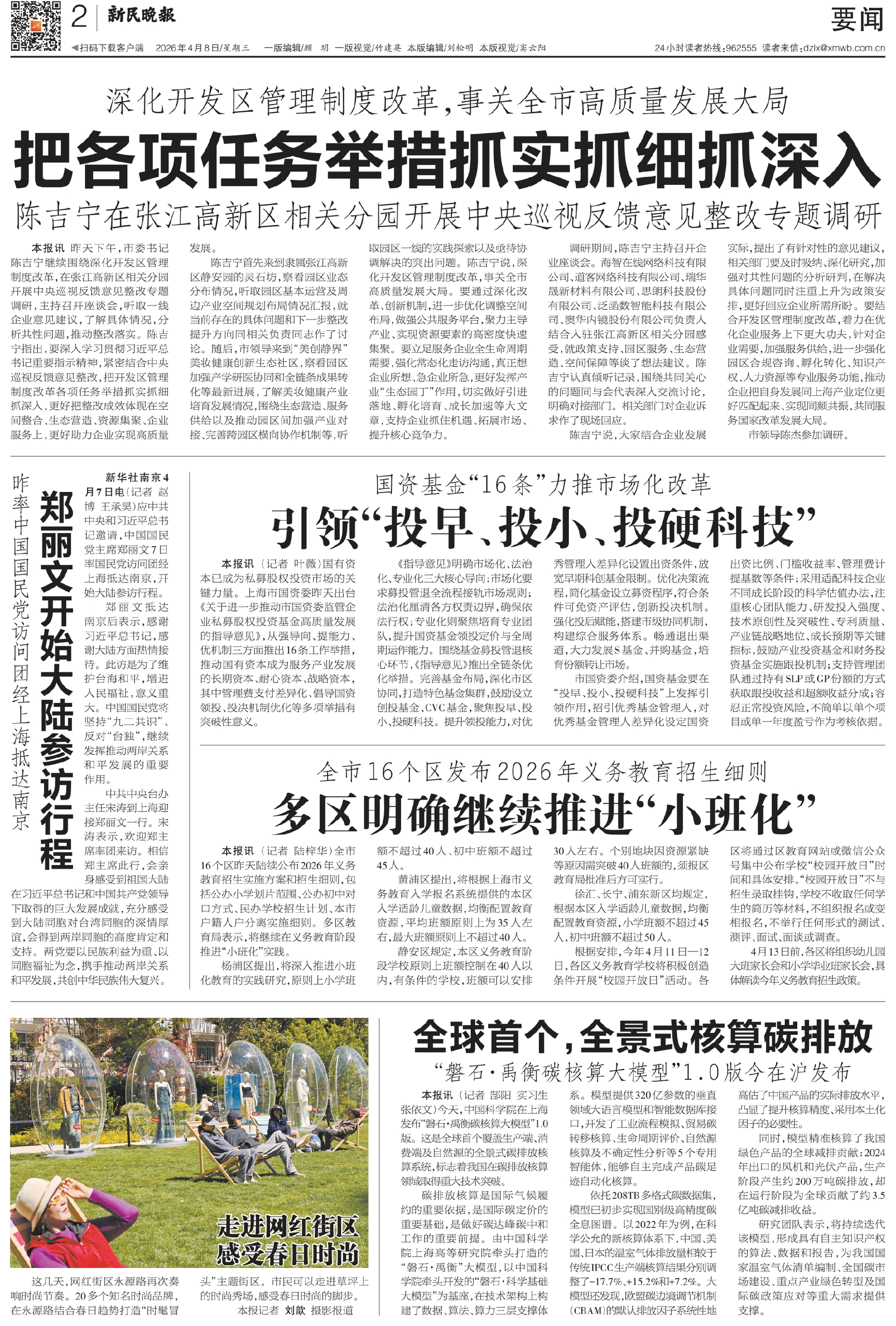 陈吉宁首先来到隶属张江高新区静安园的灵石坊,察看园区业态分布情况,听取园区基本运营及周边产业空间规划布局情况汇报,就当前存在的具体问题和下一步整改提升方向同相关负责同志作了讨论。随后,市领导来到“美创静界”美妆健康创新生态社区,察看园区加强产学研医协同和全链条成果转化等最新进展,了解美妆健康产业培育发展情况,围绕生态营造、服务供给以及推动园区间加强产业对接、完善跨园区横向协作机制等,听取园区一线的实践探索以及亟待协调解决的突出问题。陈吉宁说,深化开发区管理制度改革,事关全市高质量发展大局。要通过深化改革、创新机制,进一步优化调整空间布局,做强公共服务平台,聚力主导产业、实现资源要素的高密度快速集聚。要立足服务企业全生命周期需要,强化常态化走访沟通,真正想企业所想、急企业所急,更好发挥产业“生态园丁”作用,切实做好引进落地、孵化培育、成长加速等大文章,支持企业抓住机遇、拓展市场、提升核心竞争力。