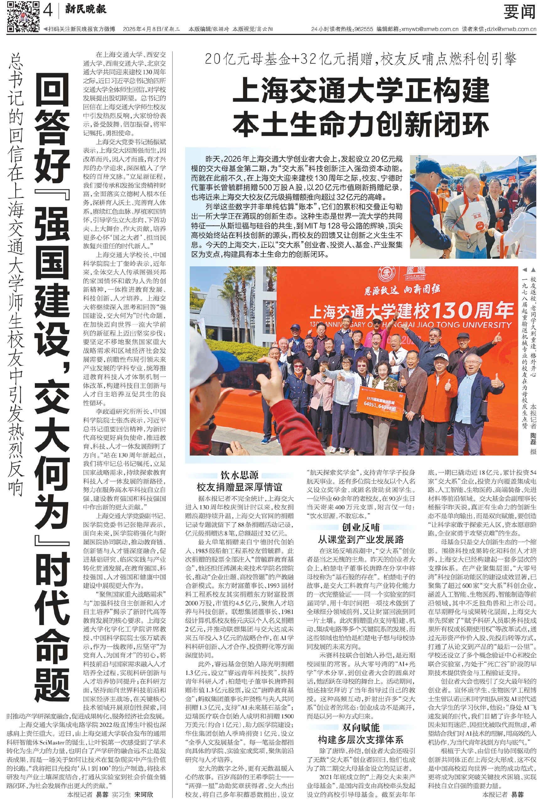 上海交大党委书记杨振斌表示,上海交大因图强而生,因改革而兴,因人才而盛,育才兴邦的办学追求,深深植入了学校的百卅文脉。“立足新征程,我们要传承和发扬宝贵精神财富,全面落实立德树人根本任务,深耕育人沃土、完善育人体系,赓续红色血脉、厚植家国情怀,引导学生立大志向、下苦功夫、上大舞台、作大贡献,培养更多心怀‘国之大者’、担当民族复兴重任的时代新人。”