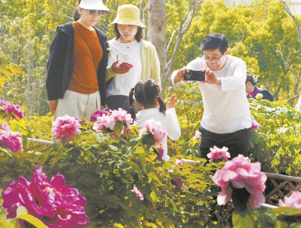 图为园中牡丹花竞相盛开,吸引游客前来赏花拍照