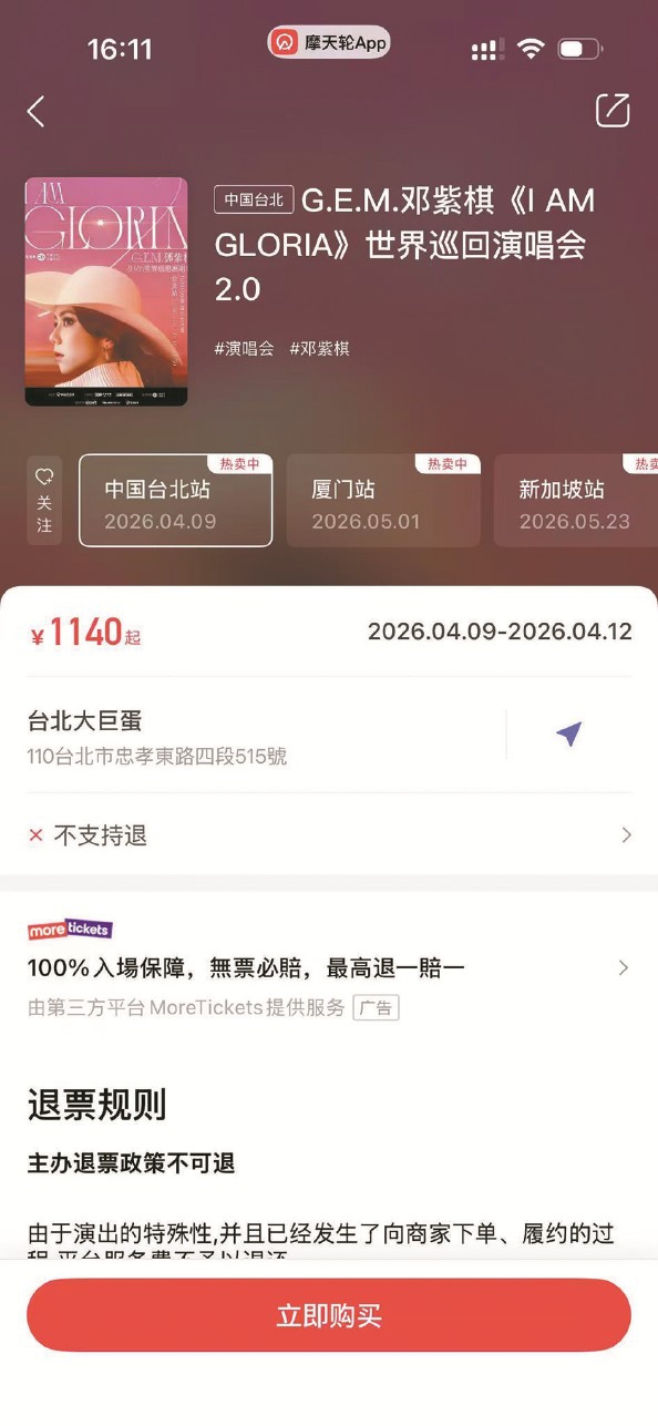 记者随后登录“摩天轮”App,找到了欣欣所购买的4月9日邓紫棋台北大巨蛋演唱会信息,平台显示该场次演唱会门票仍处于“热卖中”,页面退票规则显示为“不支持退”,点击“服务说明”后弹出一行小字:“由于文体演出的特殊性,本产品不支持退票,敬请谅解。”