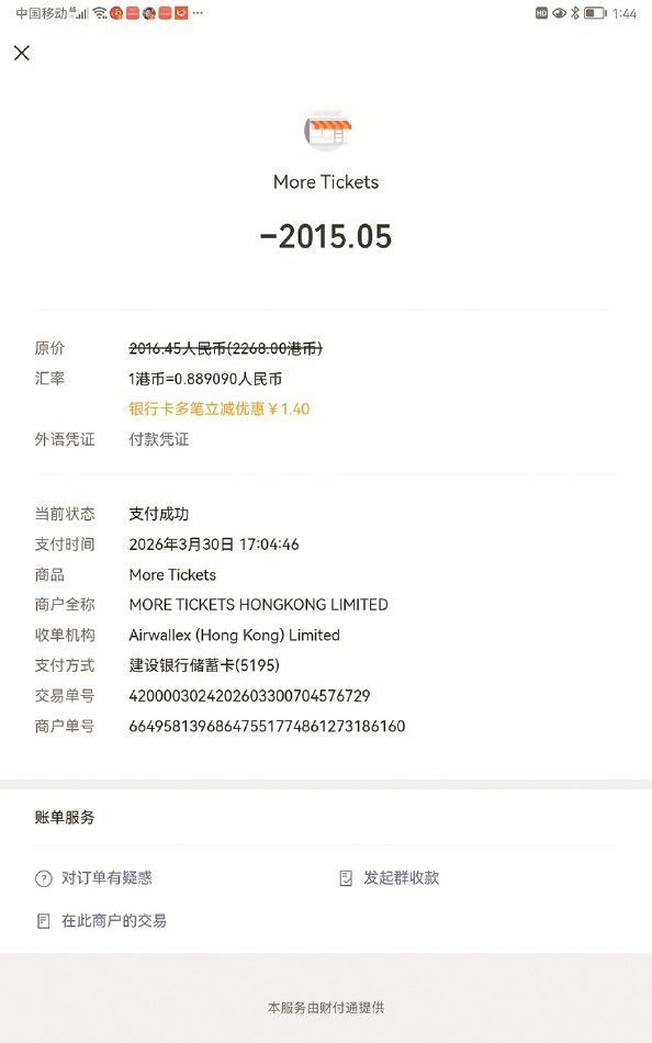 这样艰难的日子苦熬着,没想到一笔冒出来的订单再起波澜。据欧阳先生讲述,平时女儿卧床在家,四肢瘫痪仅有两根小拇指可以动弹,自己便给女儿准备了一个平板电脑用作消遣,女儿与外界的简单交流也靠在平板电脑上打字。3月30日傍晚5点多,他突然发现女儿的微信上有一条2000多元的支付记录,大惊之下,连忙点进去查看,发现是16岁的女儿在一家名为“摩天轮”的票务平台购买了一张4月9日邓紫棋的中国台北站演唱会门票。“女儿以前就喜欢听邓紫棋的歌,估计是看到了她的演唱会信息,不小心点进去的。”欧阳先生讲,女儿的微信绑定了她的银行卡,卡里的存款是爷爷奶奶外公外婆给她存进去用作应急的钱,没想到却被购买了演唱会门票。
