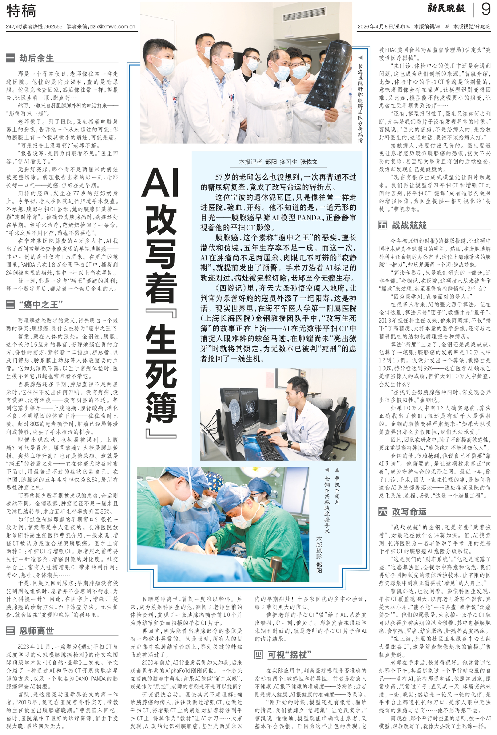 《西游记》里,齐天大圣孙悟空闯入地府,让判官为乐善好施的寇员外添了一纪阳寿,这是神话。现实世界里,在海军军医大学第一附属医院(上海长海医院)金钢教授团队手中,“改写生死簿”的故事正在上演——AI在无数张平扫CT中捕捉人眼难辨的蛛丝马迹,在肿瘤尚未“亮出獠牙”时就将其锁定,为无数本已被判“死刑”的患者抢回了一线生机。