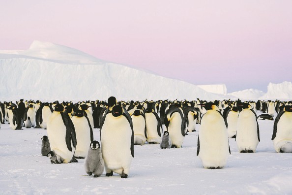帝企鹅主要生活在南极洲附近海水冻结形成的冰面上。隆冬时节,雄性帝企鹅会用脚掌为企鹅蛋保温。小企鹅在换羽期、羽毛尚不具备防水能力时,也栖息在冰面上。