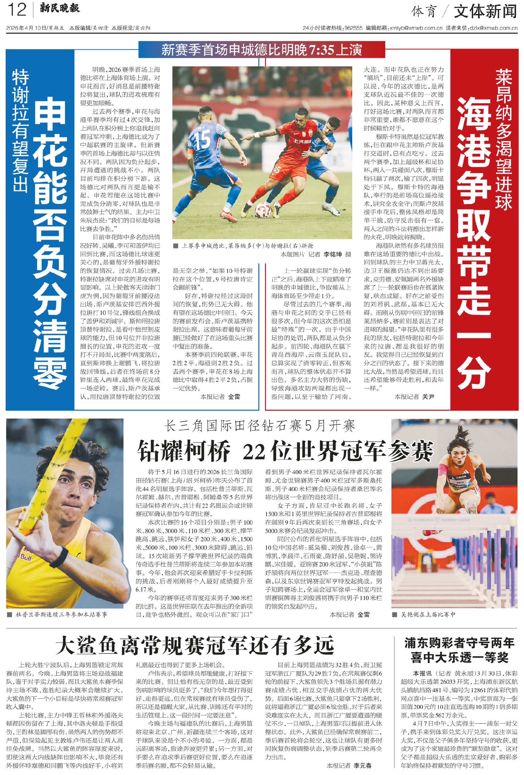 新赛季首场申城德比明晚7:35上演
