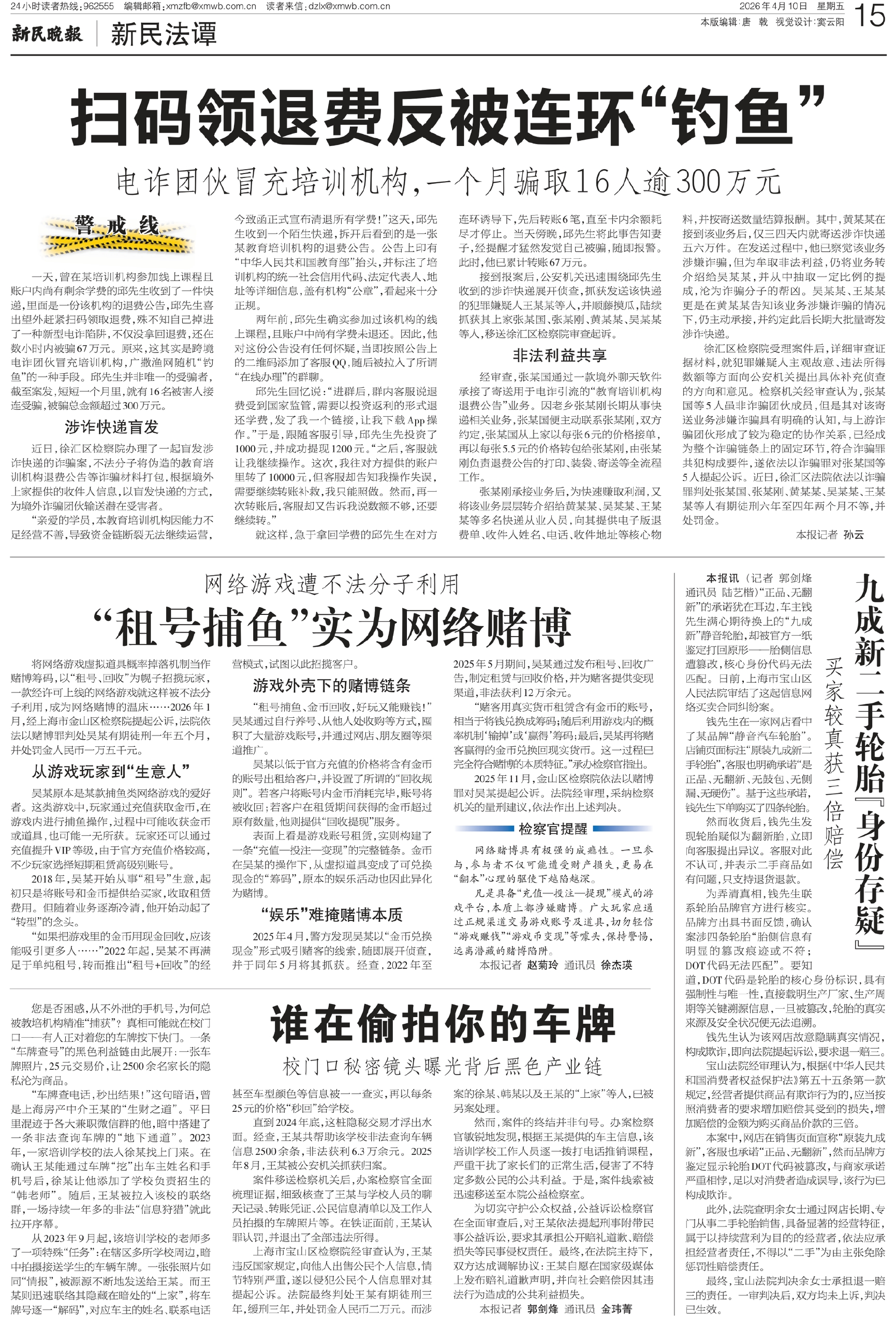 一天,曾在某培训机构参加线上课程且账户内尚有剩余学费的邱先生收到了一件快递,里面是一份该机构的退费公告,邱先生喜出望外赶紧扫码领取退费,殊不知自己掉进了一种新型电诈陷阱,不仅没拿回退费,还在数小时内被骗67万元。原来,这其实是跨境电诈团伙冒充培训机构,广撒渔网随机“钓鱼”的一种手段。邱先生并非唯一的受骗者,截至案发,短短一个月里,就有16名被害人接连受骗,被骗总金额超过300万元。