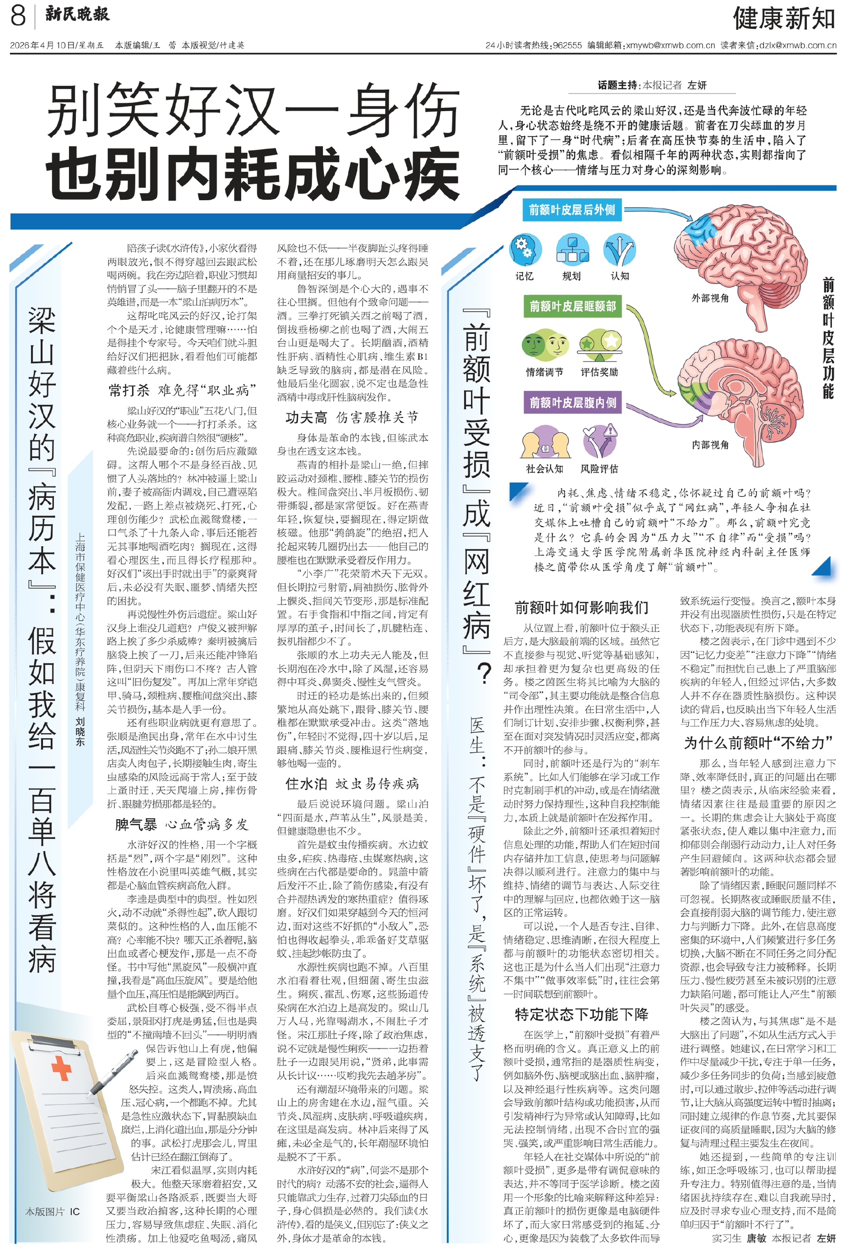 无论是古代叱咤风云的梁山好汉,还是当代奔波忙碌的年轻人,身心状态始终是绕不开的健康话题。前者在刀尖舔血的岁月里,留下了一身“时代病”;后者在高压快节奏的生活中,陷入了“前额叶受损”的焦虑。看似相隔千年的两种状态,实则都指向了同一个核心——情绪与压力对身心的深刻影响。