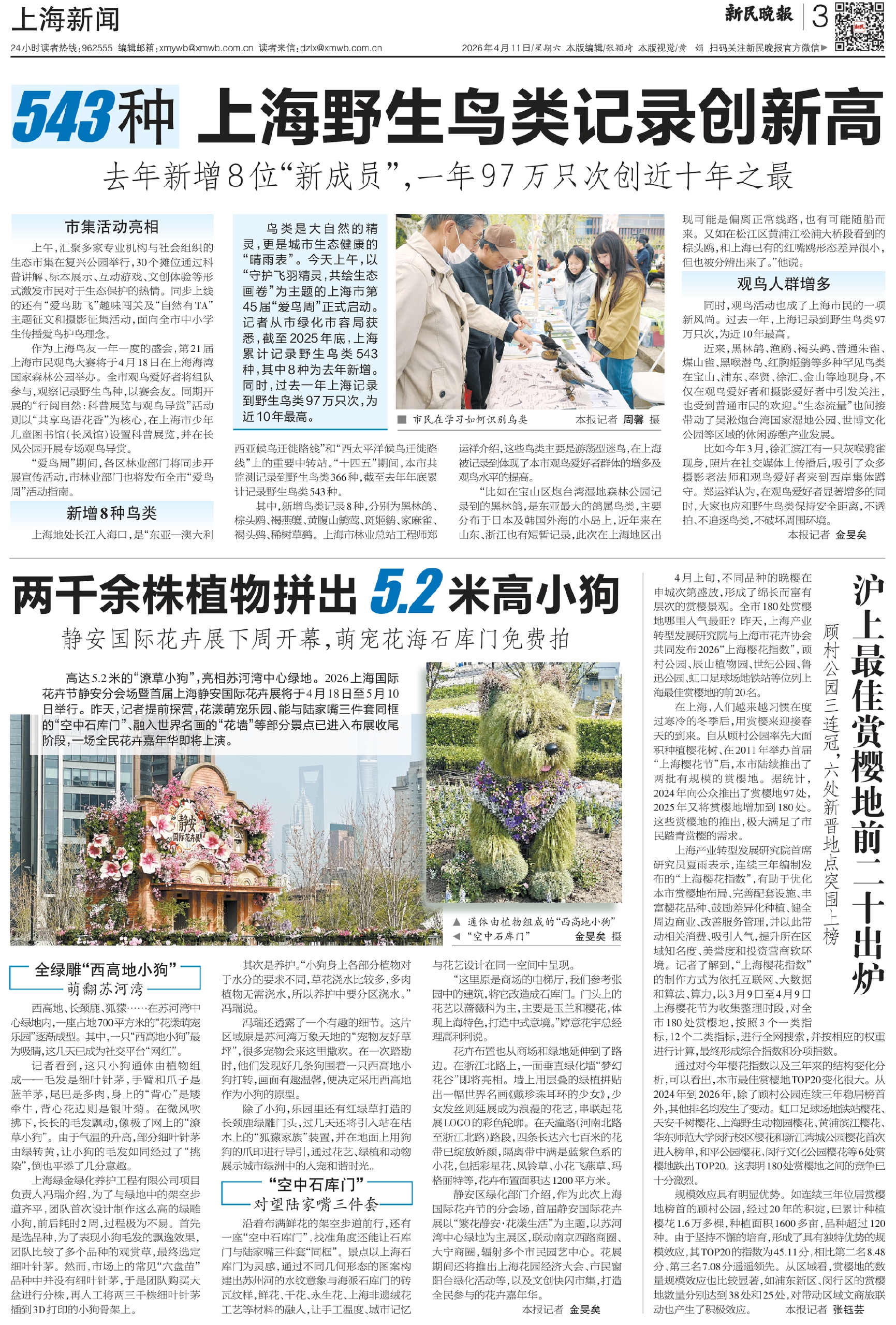 鸟类是大自然的精灵,更是城市生态健康的“晴雨表”。今天上午,以“守护飞羽精灵,共绘生态画卷”为主题的上海市第45届“爱鸟周”正式启动。记者从市绿化市容局获悉,截至2025年底,上海累计记录野生鸟类543种,其中8种为去年新增。同时,过去一年上海记录到野生鸟类97万只次,为近10年最高。