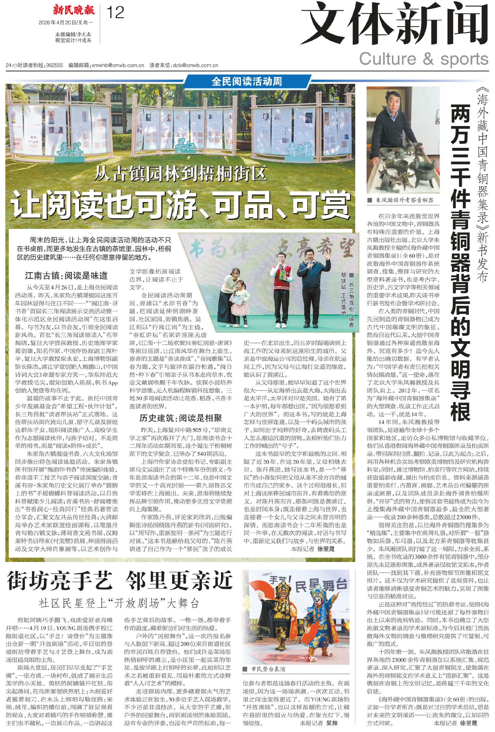 从今天至4月26日,是上海全民阅读活动周。昨天,朱家角古镇课植园这座百年园林显得与往日不同——“‘阅江南·寻书香’首届长三角阅读展示交流活动暨一体化示范区全民阅读活动周”在这里启幕。与书为友,以书会友,引领全民阅读新风尚。首批“长三角阅读领读人”名单揭晓,复旦大学资深教授、历史地理学家葛剑雄,知名作家、中国作协原副主席叶辛,复旦大学教授梁永安,上海博物馆副馆长陈杰,浦江学堂创始人鲍鹏山,《中国诗词大会》命题专家方笑一,华东师范大学教授毛尖,混知创始人陈磊,帆书App创始人樊登等均在列。