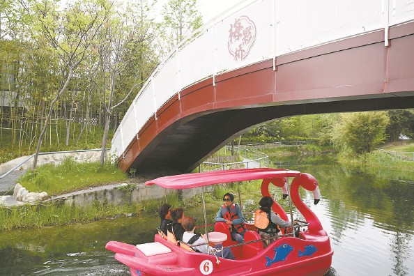游客在庄行花屿公园内体验电动游船
