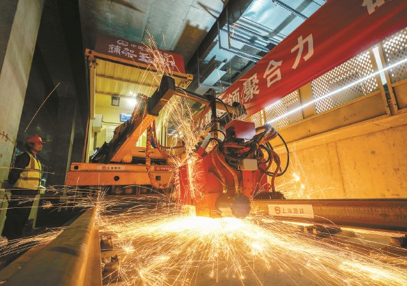今天上午,崇明岛陈家镇车站内最后一对钢轨接头焊接,轨交22号线正式实现全线轨道贯通 本报记者 陈梦泽 摄