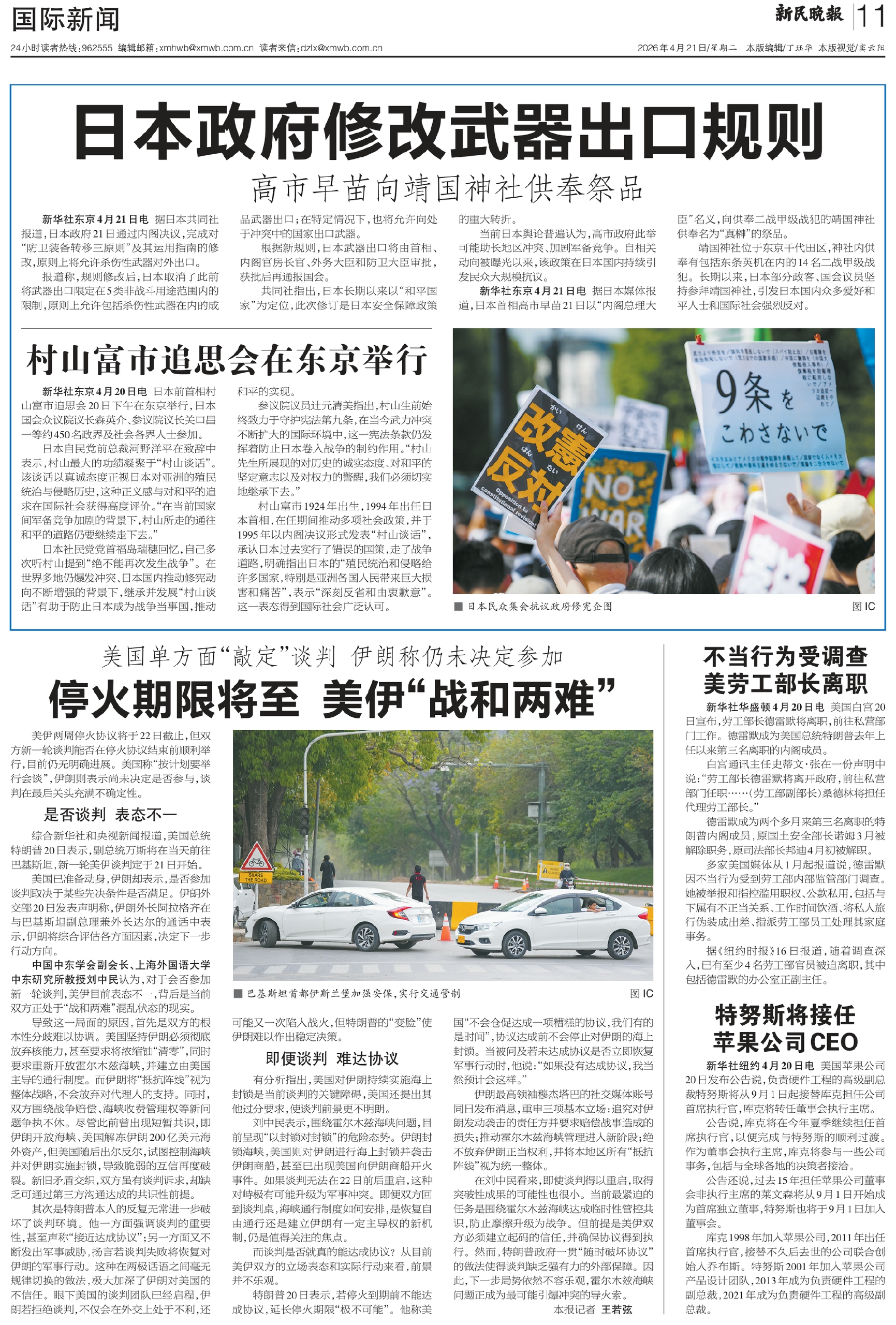 新华社东京4月21日电 据日本媒体报道,日本首相高市早苗21日以“内阁总理大臣”名义,向供奉二战甲级战犯的靖国神社供奉名为“真榊”的祭品。