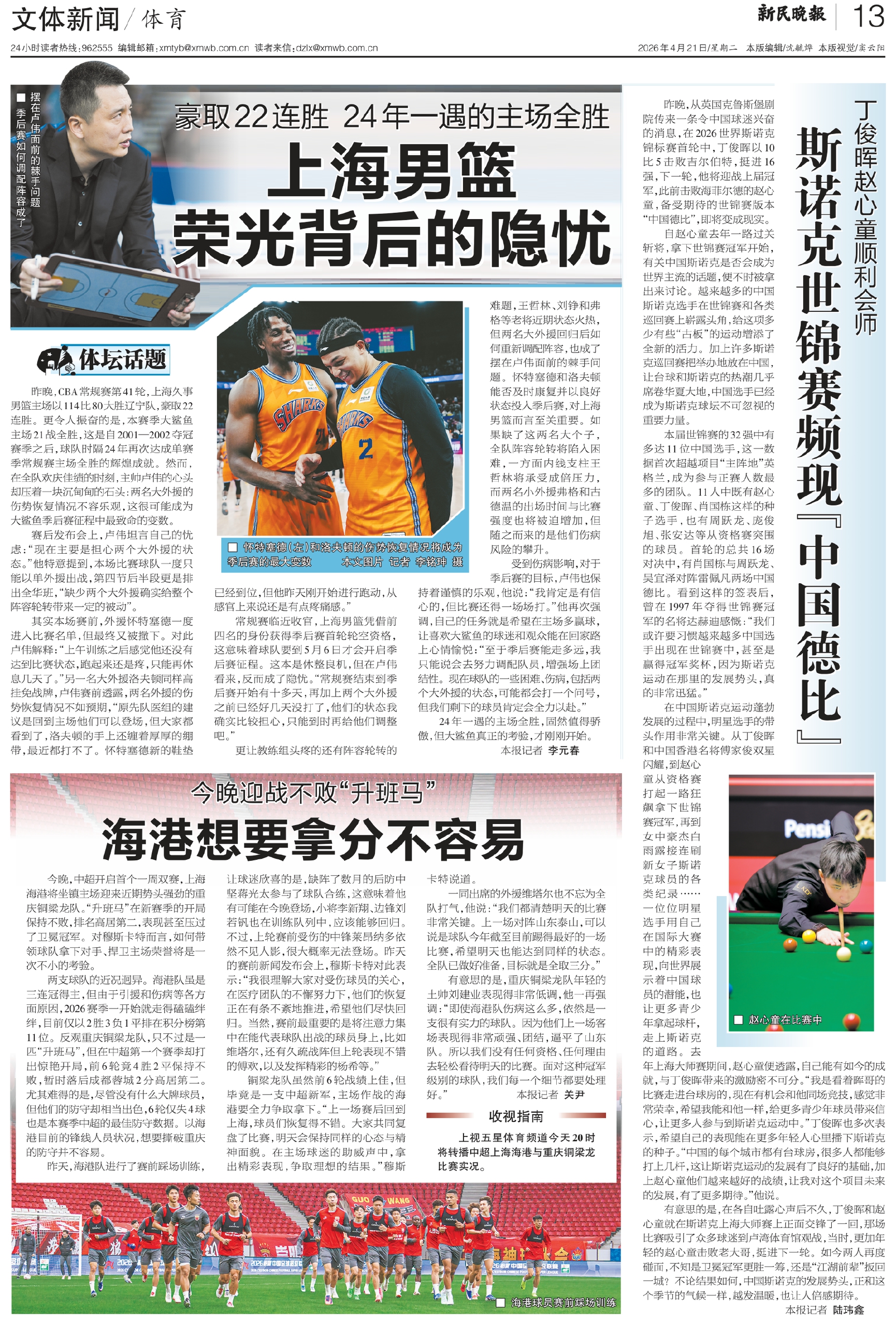 斯诺克世锦赛频现“中国德比” 海港想要拿分不容易 上海男篮荣光背后的隐忧