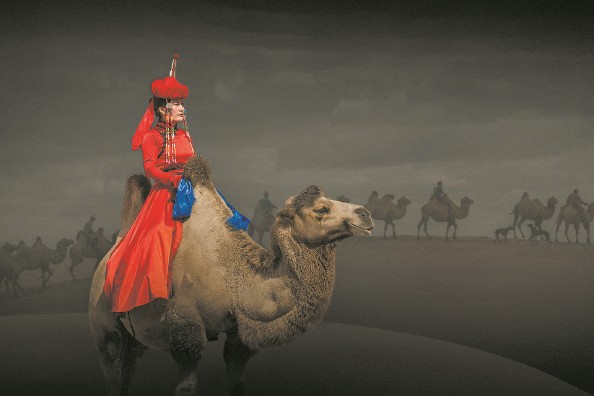 风起大漠,浓云密布,一场国际摄影大赛的开幕式在著名的宝古图沙漠拉开序幕,开幕仪式颇为壮观,作为摄影人的我,也在这场面浩大、人声鼎沸的氛围中努力寻找自己的拍摄目标。突然之间,一名美丽的蒙古族女子,身着一袭大红的蒙古族传统长袍出现在我的视野里,她骑着骆驼,透着一股子英气,予人以“红颜亦可擎天地,肝胆长存侠客风”的不凡气度。作为摄影人的我,顿时感到眼前一亮,这简直就是现实中的大漠女神啊!接下来的时间,我就跑前跑后地围着她拍了,足足跟了半个多小时,当她走到一大型驼队跟前,景深前后都有呼应时,我暗自庆幸:今天可以拍到令自己满意的一幅图了。