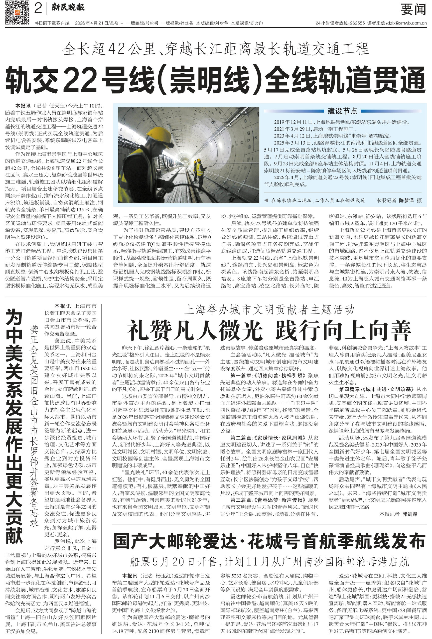 为中美关系发展作出更大贡献 国产大邮轮爱达·花城号首航季航线发布 礼赞凡人微光  践行向上向善 轨交22号线(崇明线)全线轨道贯通