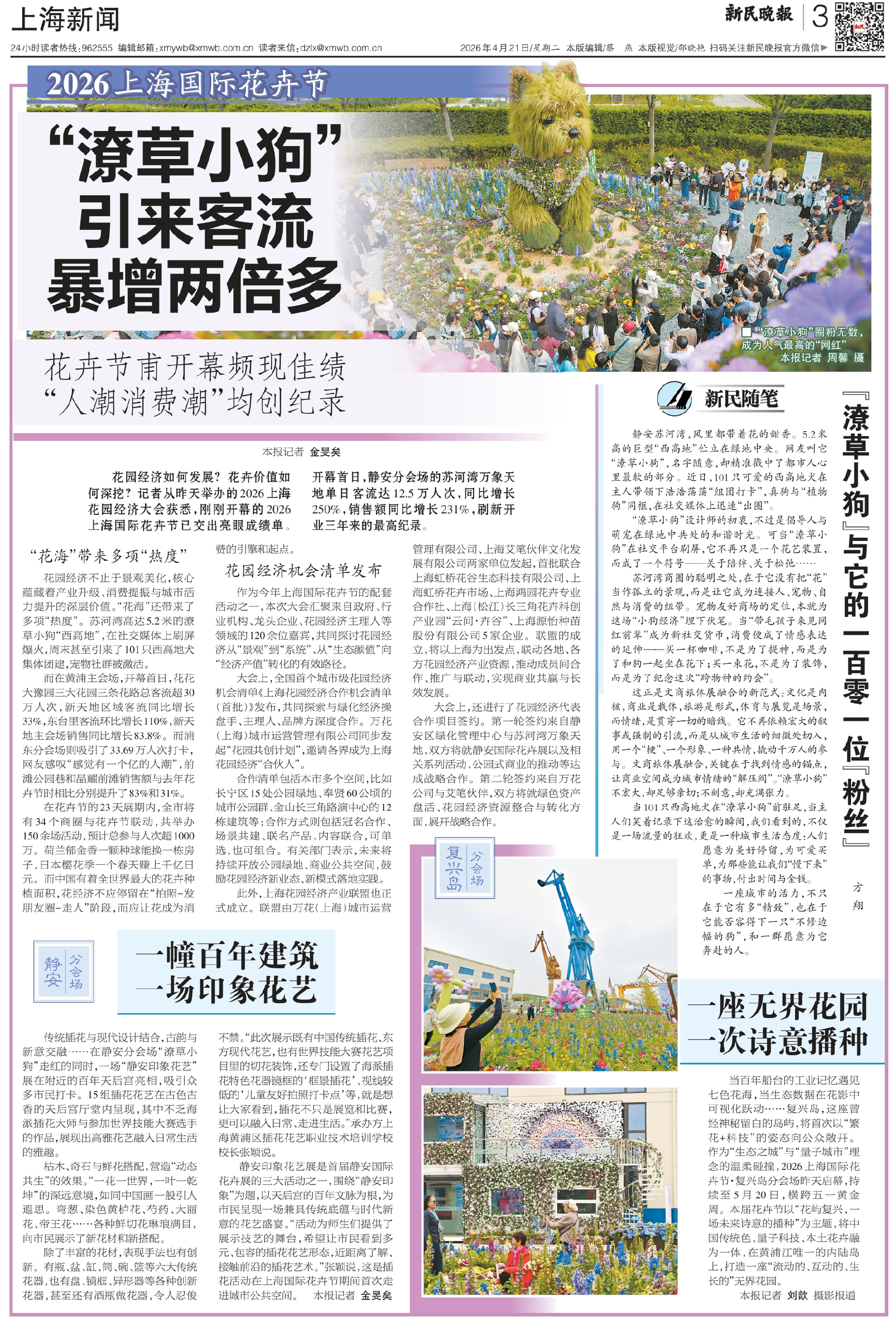 花园经济如何发展?花卉价值如何深挖?记者从昨天举办的2026上海花园经济大会获悉,刚刚开幕的2026上海国际花卉节已交出亮眼成绩单。开幕首日,静安分会场的苏河湾万象天地单日客流达12.5万人次,同比增长250%,销售额同比增长231%,刷新开业三年来的最高纪录。