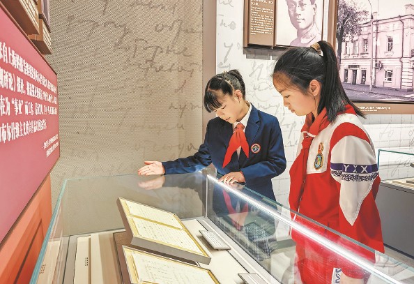 中共一大纪念馆内,上海市黄浦区卢湾一中心小学的红领巾讲解员在为嘉兴的学生讲解 本报记者 陶磊 摄