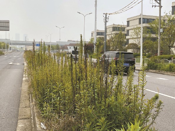 除了垃圾遍地,该路段部分绿化隔离带还被杂草彻底占据。在金港路靠近龙东大道的一侧,一人多高的杂草密密麻麻、长势凶猛,枝繁叶茂间将整个绿化带完全遮蔽。这些杂草种类繁杂,部分茎秆粗度堪比手指,远远望去如同一片荒芜的野草地,与周边崭新的柏油马路、现代化写字楼形成鲜明反差,显得格格不入。