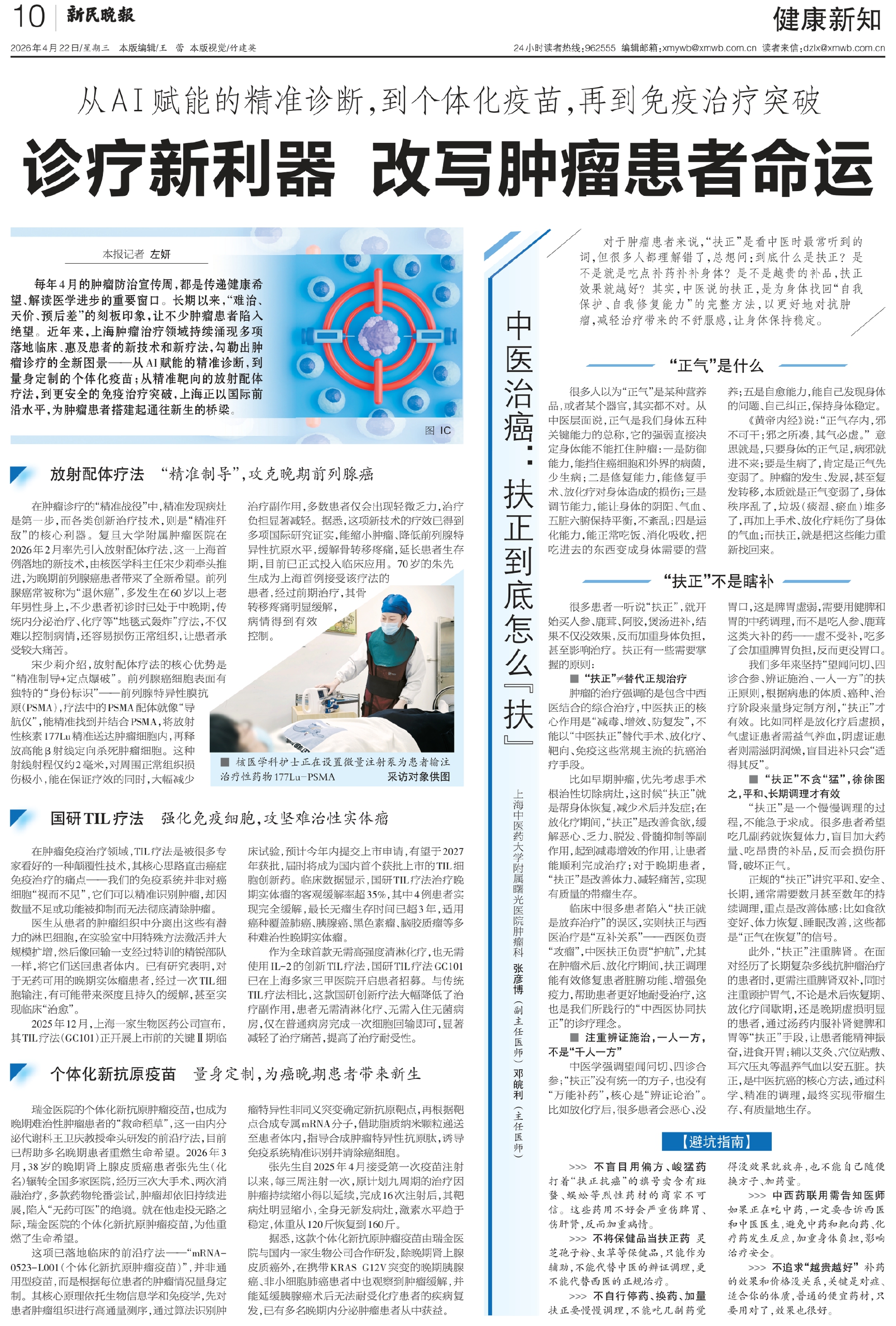 每年4月的肿瘤防治宣传周,都是传递健康希望、解读医学进步的重要窗口。长期以来,“难治、天价、预后差”的刻板印象,让不少肿瘤患者陷入绝望。近年来,上海肿瘤治疗领域持续涌现多项落地临床、惠及患者的新技术和新疗法,勾勒出肿瘤诊疗的全新图景——从AI赋能的精准诊断,到量身定制的个体化疫苗;从精准靶向的放射配体疗法,到更安全的免疫治疗突破,上海正以国际前沿水平,为肿瘤患者搭建起通往新生的桥梁。
