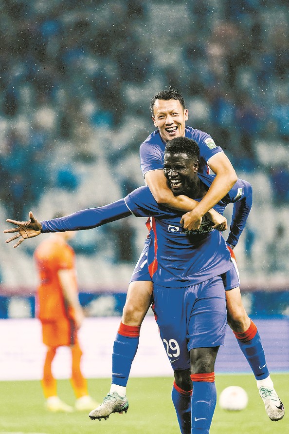 盖伊(下)与队友庆祝进球 记者 李铭珅 摄