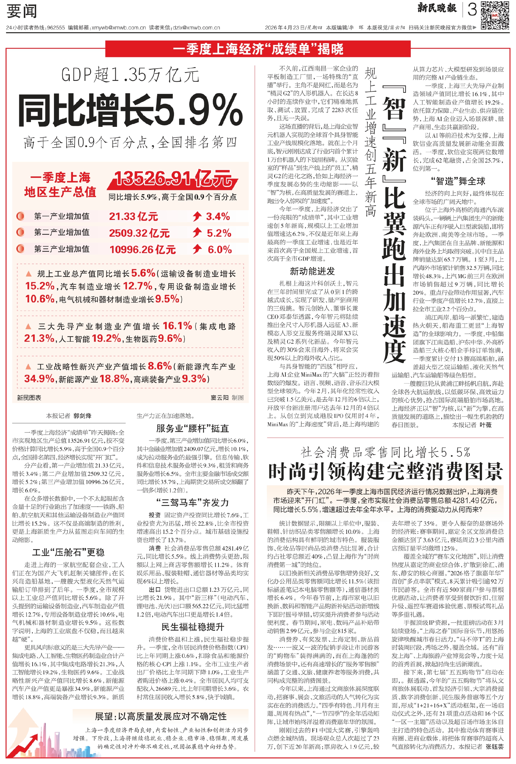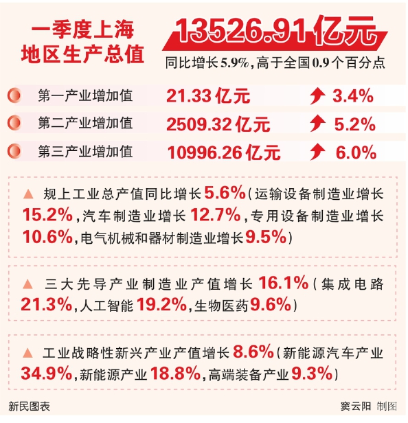 一季度上海经济“成绩单”昨天揭晓:全市实现地区生产总值13526.91亿元,按不变价格计算同比增长5.9%,高于全国0.9个百分点,全国排名第四,经济增长实现“开门红”。