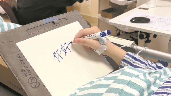 记者从展示的视频中看到,患者大脑产生握笔意图的瞬间,手部便已同步启动——该指标已达到国际植入式脑机接口延时控制的领先水平。