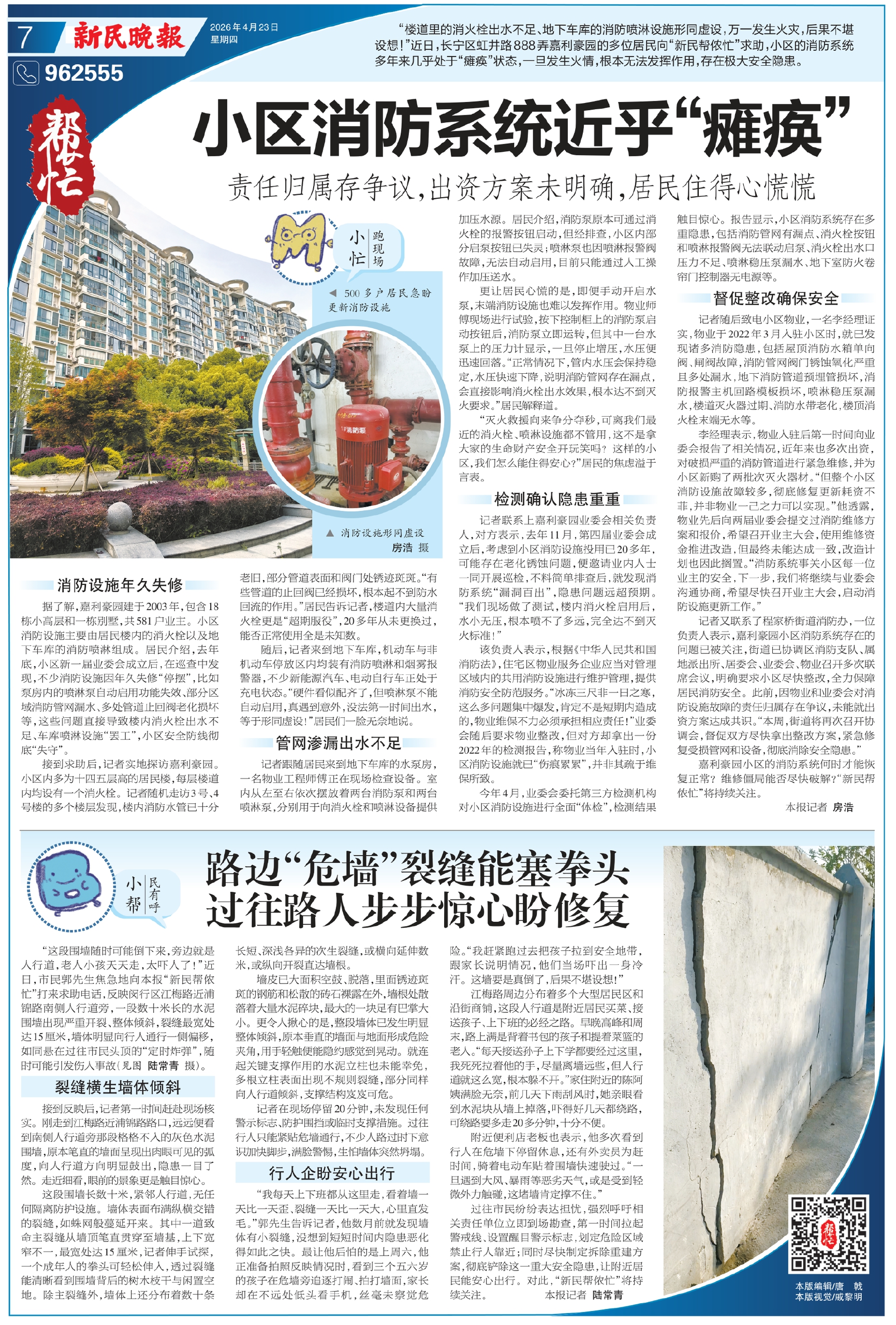 嘉利豪园小区的消防系统何时才能恢复正常?维修僵局能否尽快破解?“新民帮侬忙”将持续关注。本报记者 房浩