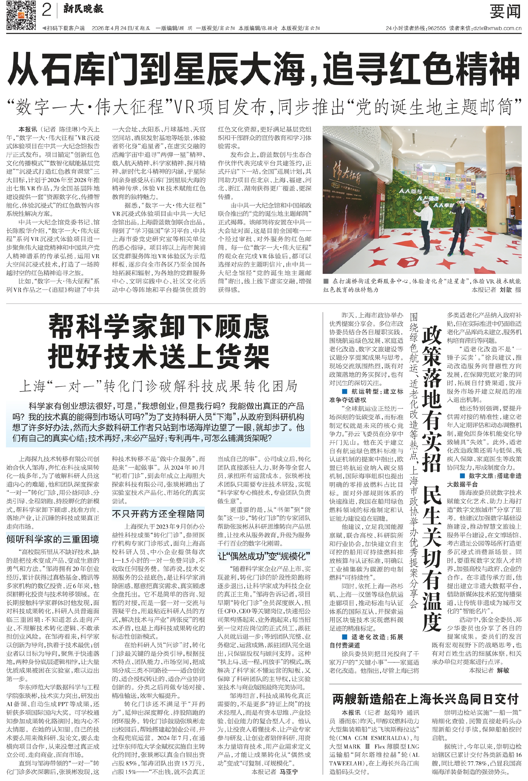 本报讯(记者 陈佳琳)今天上午,“数字一大·伟大征程”VR沉浸式体验项目在中共一大纪念馆报告厅正式发布。项目锚定“创新红色文化传播模式”“数智化赋能基层党建”“沉浸式打造红色教育课堂”三大目标,计划于2026年至2028年推出七集VR作品,为全国基层阵地建设提供一套“资源数字化、传播智能化、体验沉浸式”的红色数智内容系统性解决方案。