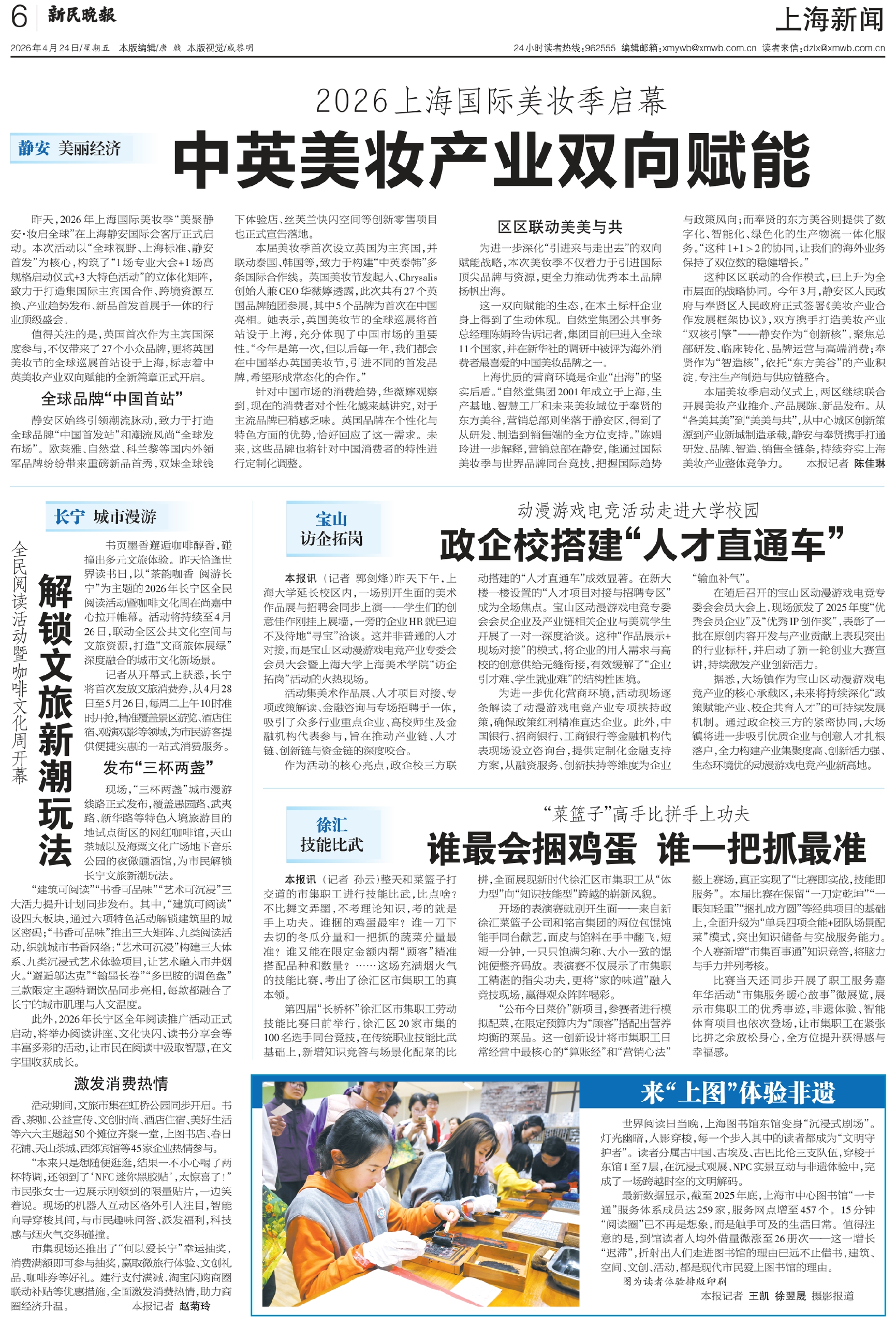 本届美妆季启动仪式上,两区继续联合开展美妆产业推介、产品展陈、新品发布。从“各美其美”到“美美与共”,从中心城区创新策源到产业新城制造承载,静安与奉贤携手打通研发、品牌、智造、销售全链条,持续夯实上海美妆产业整体竞争力。 本报记者 陈佳琳