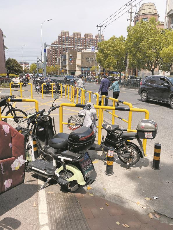 记者在现场看到,醒目的黄色铁栏杆从小区门口一直延伸到马路边缘,形成了封闭区域。栏杆内的公共人行道被划为小区非机动车停车场,密密麻麻停满了电动车、自行车,甚至还有不少共享单车随意堆放,几乎没有任何空隙。而栏杆外,原本供行人通行的空间被占用后,所有行人只能侧身走到非机动车道上,与飞驰而过的电动车、自行车擦肩而过。由于这里紧邻地铁换乘站,人流量很大,早晚高峰更是人潮涌动。