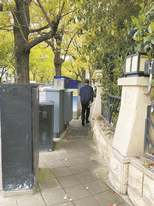 记者在现场看到,在这段长约15米的人行道上,5个大小不一、颜色各异的箱体一字排开,紧贴着旁边小区的围墙依次摆放。这些箱体分属不同的权属单位,有蓝色的电网路灯箱、灰色的路灯控制箱,还有三个黑色的通信箱体。它们像一排“拦路虎”一样,占据了人行道近三分之二的宽度,原本可供三四人并行的通道瞬间“缩水”,最窄处只有约50厘米,仅能容纳一名成年人侧身通过。
