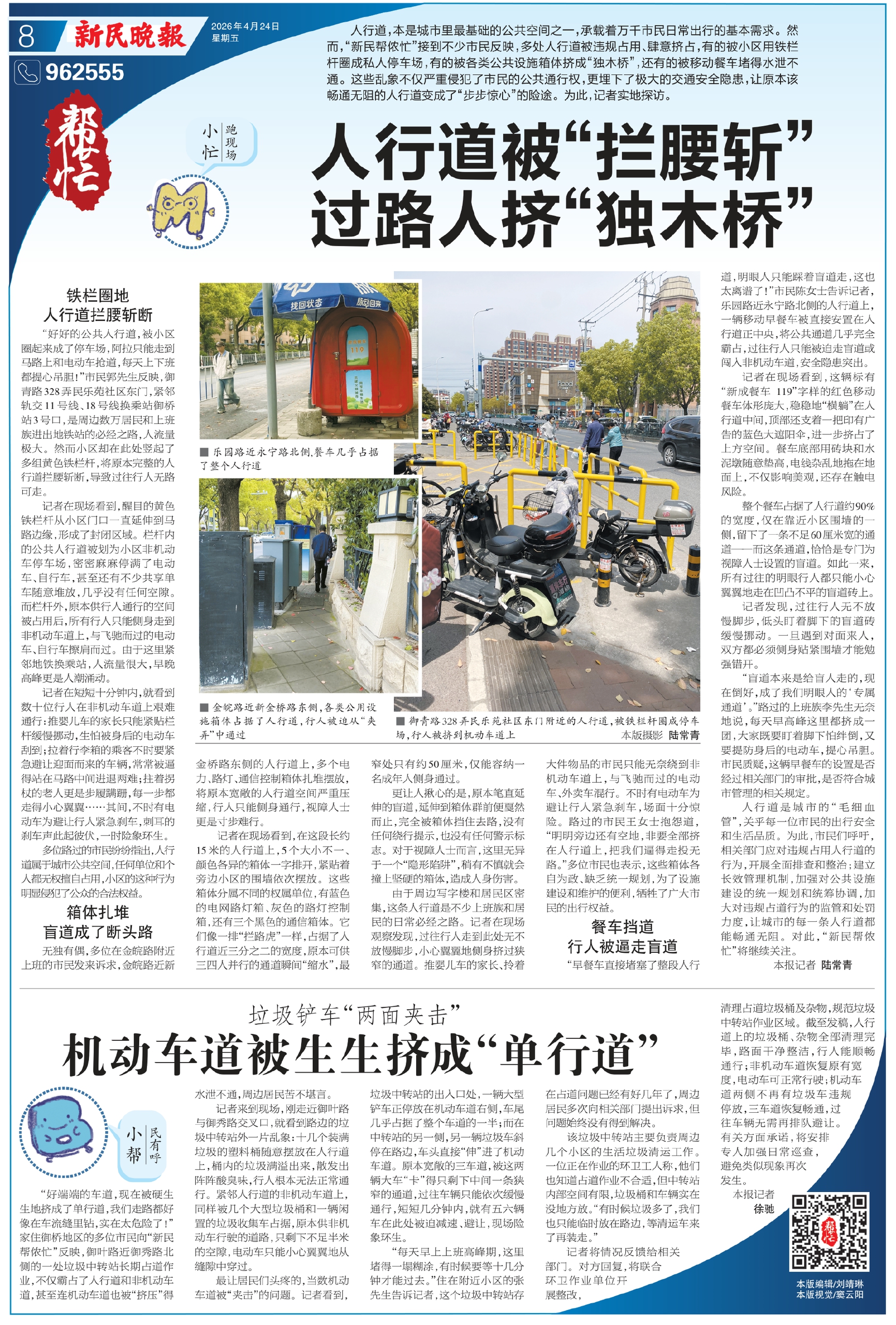 人行道是城市的“毛细血管”,关乎每一位市民的出行安全和生活品质。为此,市民们呼吁,相关部门应对违规占用人行道的行为,开展全面排查和整治;建立长效管理机制,加强对公共设施建设的统一规划和统筹协调,加大对违规占道行为的监管和处罚力度,让城市的每一条人行道都能畅通无阻。对此,“新民帮侬忙”将继续关注。