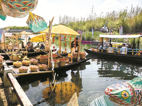 青瓦白墙掩映中的水乡蟠龙新天地,即日起推出第三届“江南风物季·水市”。 小船摇橹穿行,载着江南风物缓缓驶过廊桥;岸上风物市集小摊次第铺开,吆喝声与桨声水声交相呼应;巨型艺术装置临水而立,光影与水波相映成画,移步换景皆是诗画江南。第三届“江南风物季·水市”将持续举办至6月7日,活动以沪上首个水上市集为核心场景,为市民游客带来可游、可赏、可参与的江南生活日常。 杨建正 摄影报道