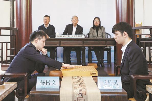 中午12时30分,第40届天元赛首局在同里天元文化苑的天弈阁开枰。中国围棋协会名誉主席华以刚宣布开始猜先,王星昊九段因为年纪比杨楷文小,本能地以为应该是对方抓子、自己猜,华以刚和裁判长吕国梁提醒,挑战制决赛应由卫冕者抓白子、挑战者猜单双。王星昊抓起白子,杨楷文猜到了黑棋。