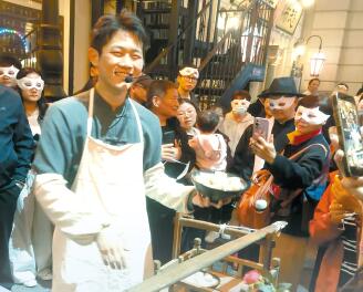 演出从最具烟火气的老上海市井生活徐徐展开(见上图),街头巷尾还原度拉满。卖香烟的小贩穿梭往来,吆喝声清脆响亮;布料商行前,顾客往来挑选,尽显市井繁华;街角馄饨摊热气腾腾,香气萦绕;糖画艺人手法精巧……老城厢弄堂里,孩童嬉闹、街坊闲谈、说书声婉转,构成鲜活生动的老上海图景,让人身临其境地感受到旧时光的温暖与鲜活。