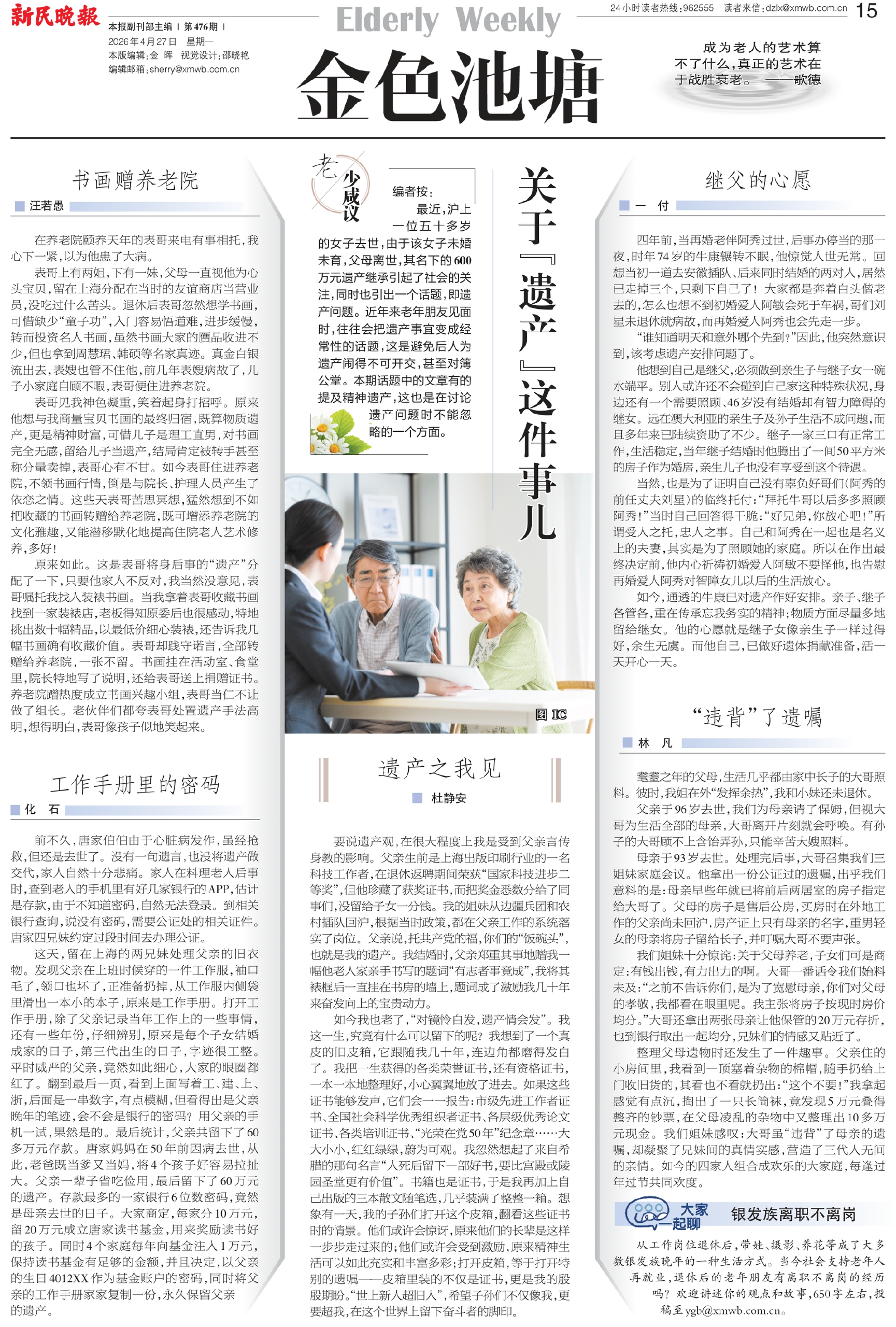 最近,沪上一位五十多岁的女子去世,由于该女子未婚未育,父母离世,其名下的600万元遗产继承引起了社会的关注,同时也引出一个话题,即遗产问题。近年来老年朋友见面时,往往会把遗产事宜变成经常性的话题,这是避免后人为遗产闹得不可开交,甚至对簿公堂。本期话题中的文章有的提及精神遗产,这也是在讨论遗产问题时不能忽略的一个方面。