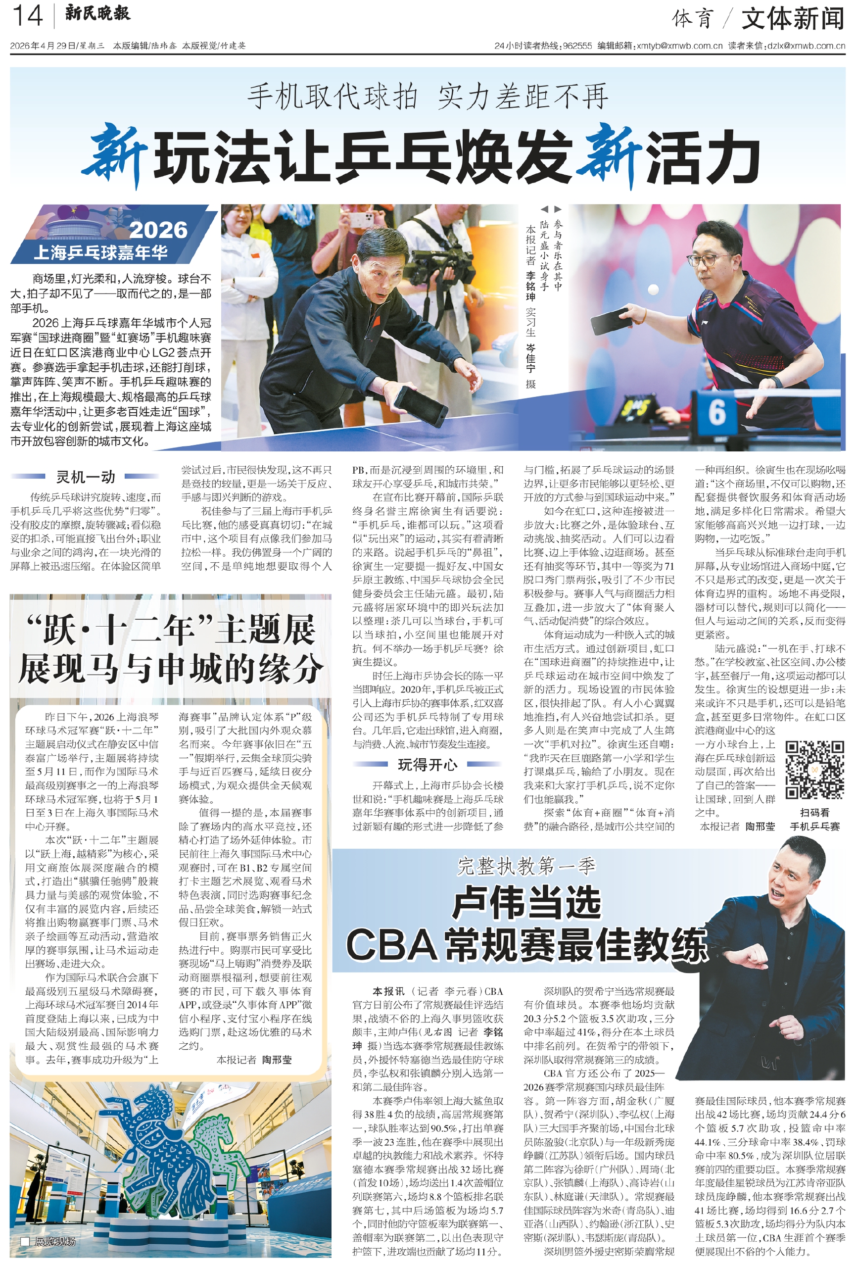 陆元盛说:“一机在手、打球不愁。”在学校教室、社区空间、办公楼宇,甚至餐厅一角,这项运动都可以发生。徐寅生的设想更进一步:未来或许不只是手机,还可以是铅笔盒,甚至更多日常物件。在虹口区滨港商业中心的这一方小球台上,上海在乒乓球创新运动层面,再次给出了自己的答案——让国球,回到人群之中。