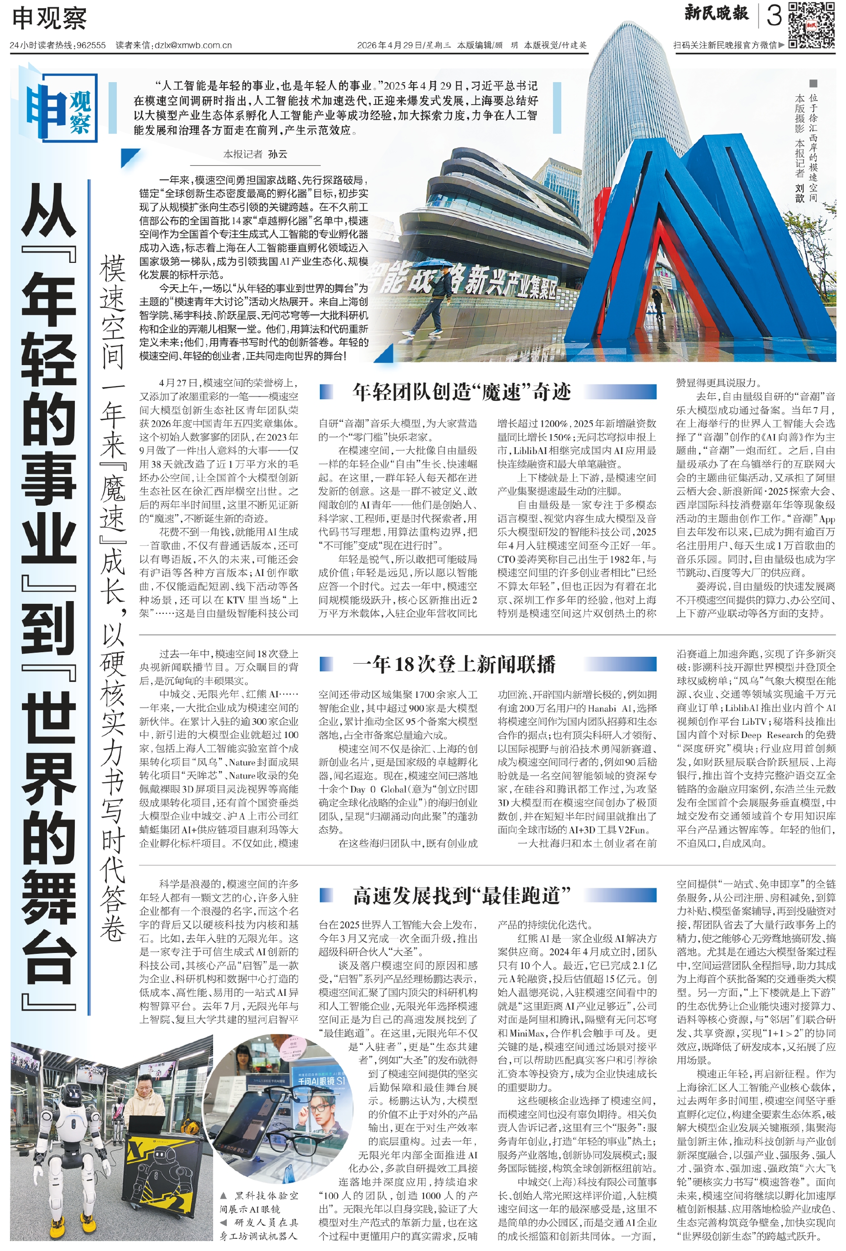 “人工智能是年轻的事业,也是年轻人的事业。”2025年4月29日,习近平总书记在模速空间调研时指出,人工智能技术加速迭代,正迎来爆发式发展,上海要总结好以大模型产业生态体系孵化人工智能产业等成功经验,加大探索力度,力争在人工智能发展和治理各方面走在前列,产生示范效应。