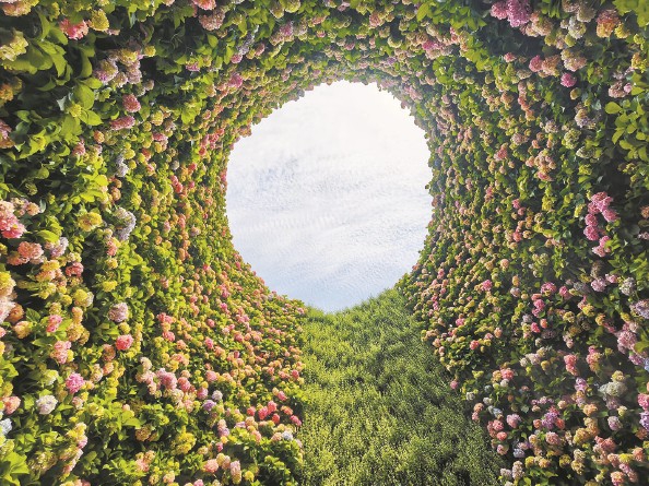 值得一提的是,现场打造的直径10米、高8米的三层巨型绣球花欢庆蛋糕艺术装置(见上图)成了最具标志性的打卡地标。