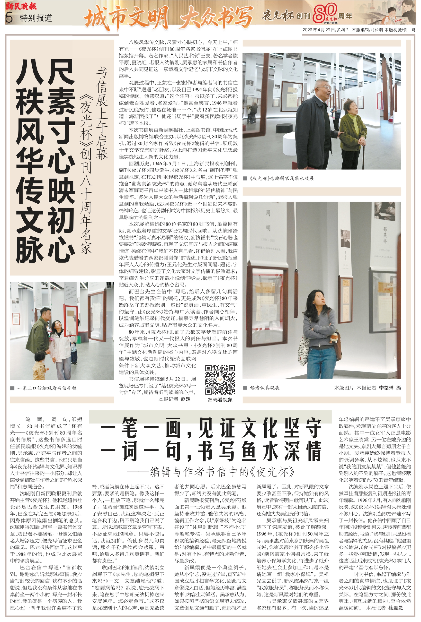 而巴金先生在信中“写吧,给后人多留几句真话吧。我们都有责任”的嘱托,更是成为《夜光杯》80年来始终坚守的办报原则。这份“说真话、重民生、有文气”的坚守,让《夜光杯》始终与广大读者、作者同心相伴,以温润笔触记录时代变迁,描摹寻常巷陌的人间烟火,成为涵养城市文明、贴近市民大众的文化名片。