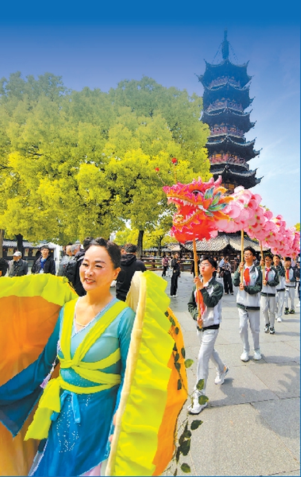 桃花龙巡游队伍走过龙华塔下 本报记者 周馨 摄