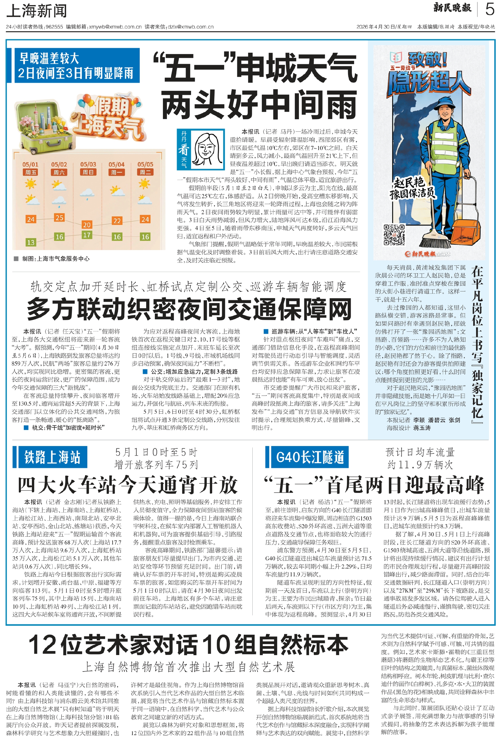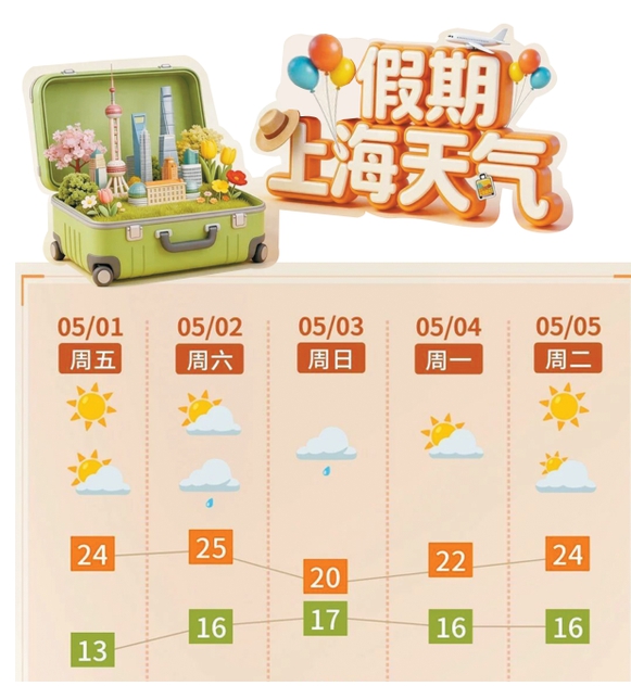 假期前半段(5月1日至2日白天),申城以多云为主,阳光在线,最高气温可达25℃左右,体感舒适。从2日傍晚开始,受高空槽东移影响,天气将发生转折,长三角地区将迎来一轮降雨过程,上海也会随之转为阵雨天气。2日夜间雨势较为明显,累计雨量可达中等,并可能伴有弱雷电。3日白天雨势减弱,但风力增大,陆地阵风可达6级,沿江沿海风力更强。4日至5日,随着雨带东移南压,申城天气再度转好,多云天气回归,适宜返程和户外活动。
