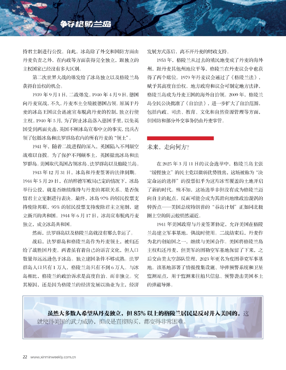 中国社会科学院美国研究所国际问题专家张国庆在接受《新民周刊》采访时指出,美国垂涎格陵兰岛这片领土已经100多年了。特朗普在其第一任期内也曾提出“购岛”设想,到了第二任期,其野心更加明显。“当然,美国并不期待着一下子让格陵兰岛并入美国,因为难度太大。现在民调显示,虽然大多数人希望从丹麦独立,但85%以上的格陵兰居民是反对并入美国的。这就使得美国的武力威胁,抑或是直接购买,都变得非常困难。改变格陵兰现状的情况并不成熟,美国可能会分步走。通过经济手段曲线救国,让格陵兰岛去丹麦化的同时又变得日益美国化。”张国庆说。