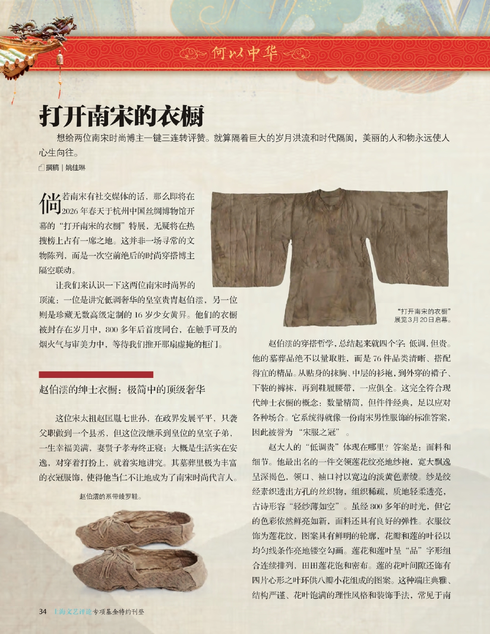 让我们来认识一下这两位南宋时尚界的顶流:一位是讲究低调奢华的皇室贵胄赵伯澐,另一位则是珍藏无数高级定制的16岁少女黄昇。他们的衣橱被封存在岁月中,800多年后首度同台,在触手可及的烟火气与审美力中,等待我们推开那扇虚掩的柜门。